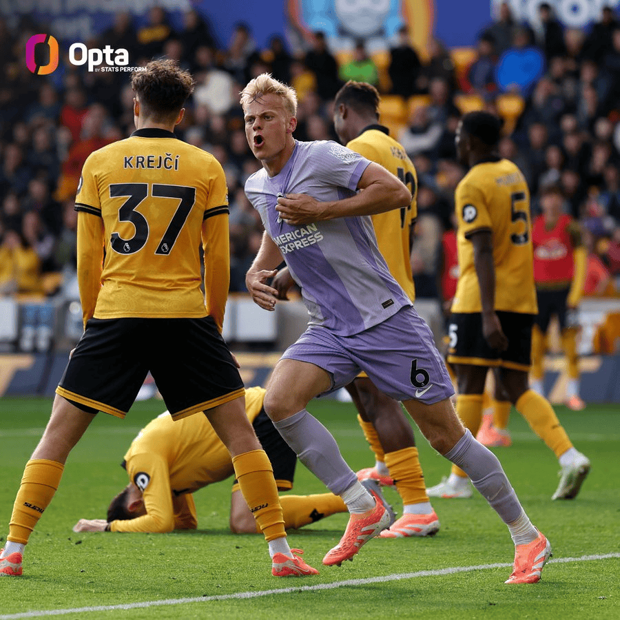 虎扑10月05日讯英超第7轮,布莱顿客战1-1战平狼队。范黑克比赛第86分钟打入扳平进球。