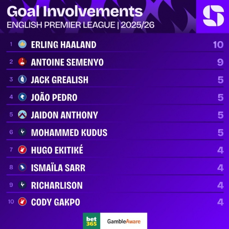 以下为本赛季英超直接参与进球数最高球员top10: