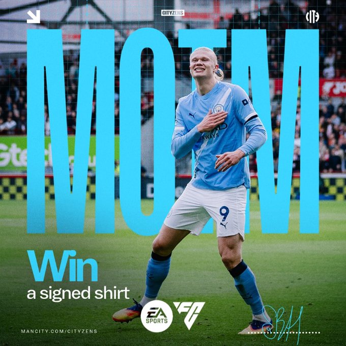 曼城官方:哈兰德当选曼城1-0布伦特福德队内最佳球员