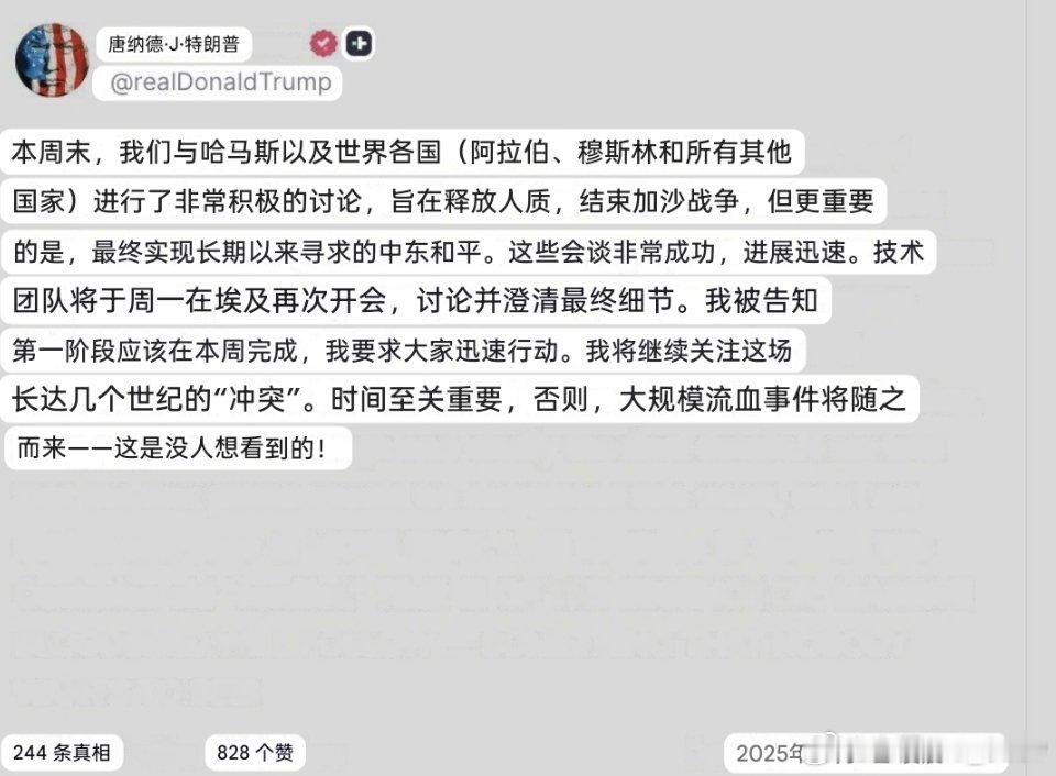 特朗普表示,与哈马斯的谈判取得了积极进展,“技术团队”将于周一在埃及会面,“澄清最终细节……时间至关重要,否则将引发大规模流血事件。”