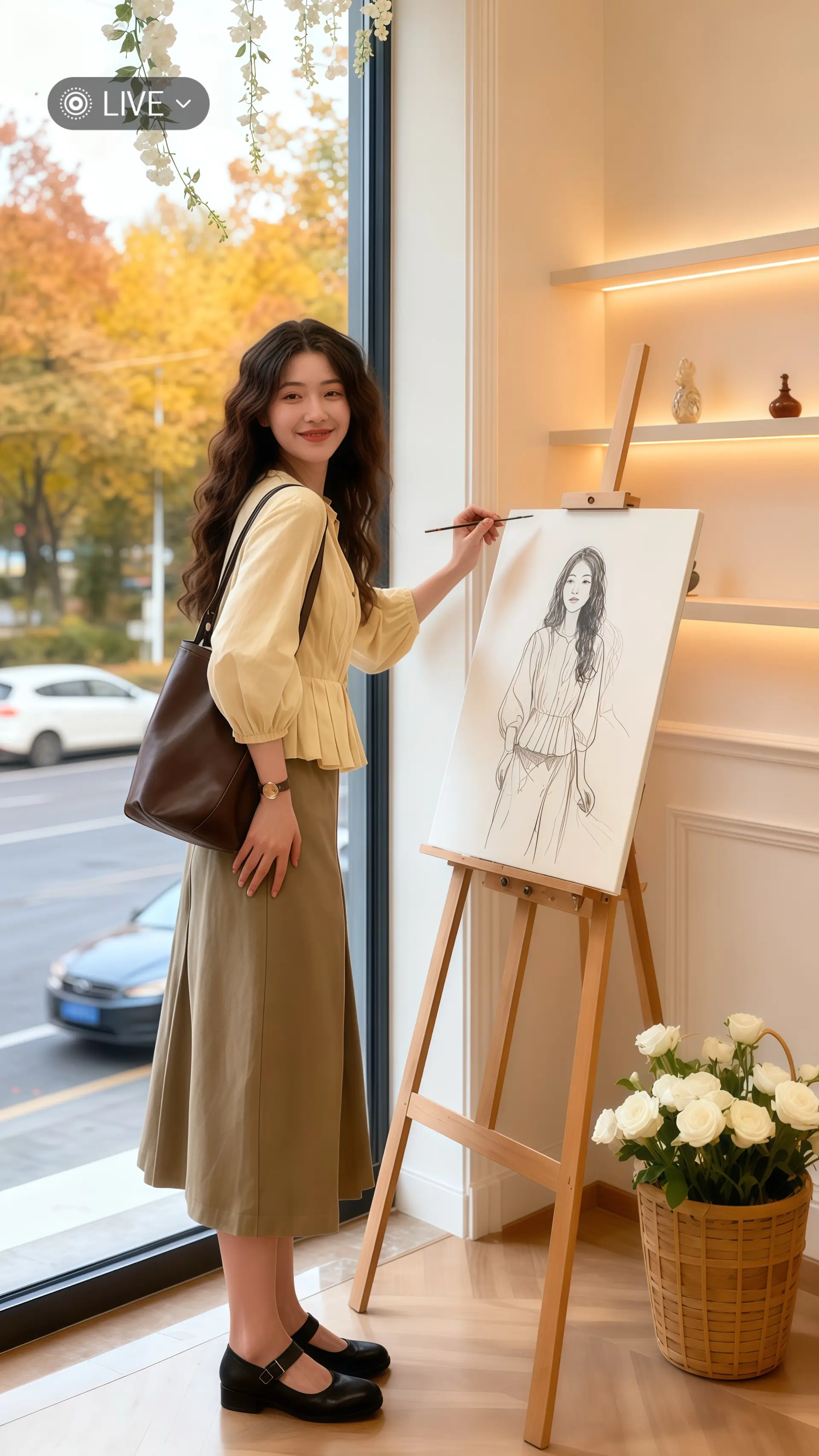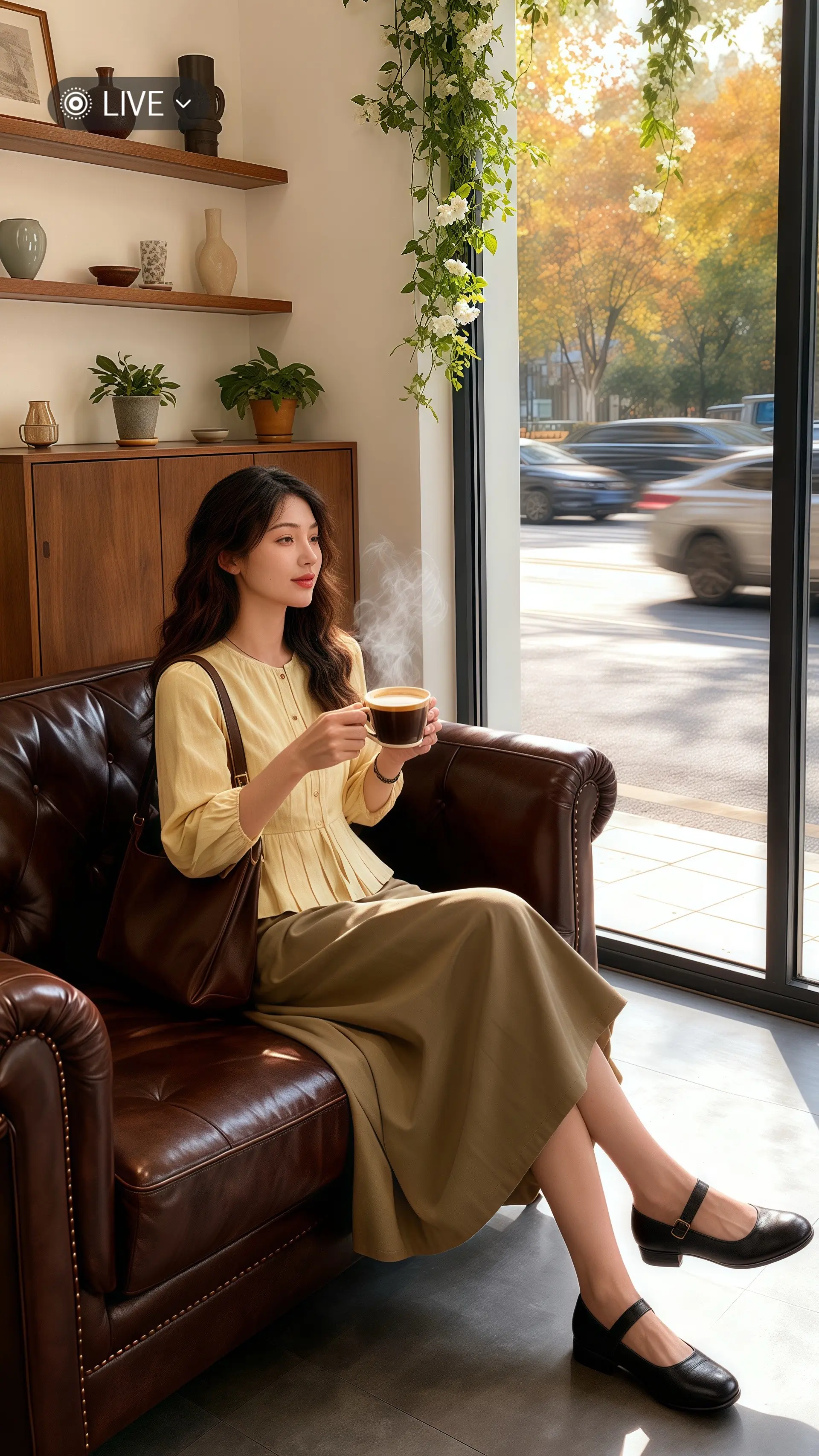她穿着时尚休闲百褶衬衫两件套,米黄色衬衫的褶皱设计灵动俏皮,搭配高腰半身裙,将秋日的松弛感与时尚感糅合得恰到好处。站在轻奢女装店的落地窗前,浅灰地板映着她的身影,身后实木置物柜的绿植与装饰品点缀出雅致氛围。窗外秋意正浓,街道上汽车穿梭,阳光透过垂落白花的绿藤洒入,给整个场景蒙上一层电影质感的滤镜。这般穿搭,既适配店内的轻奢格调,又与窗外的秋景相得益彰,仿佛将季节的韵味与穿搭的巧思,都藏进了这一方转角的美好里。
