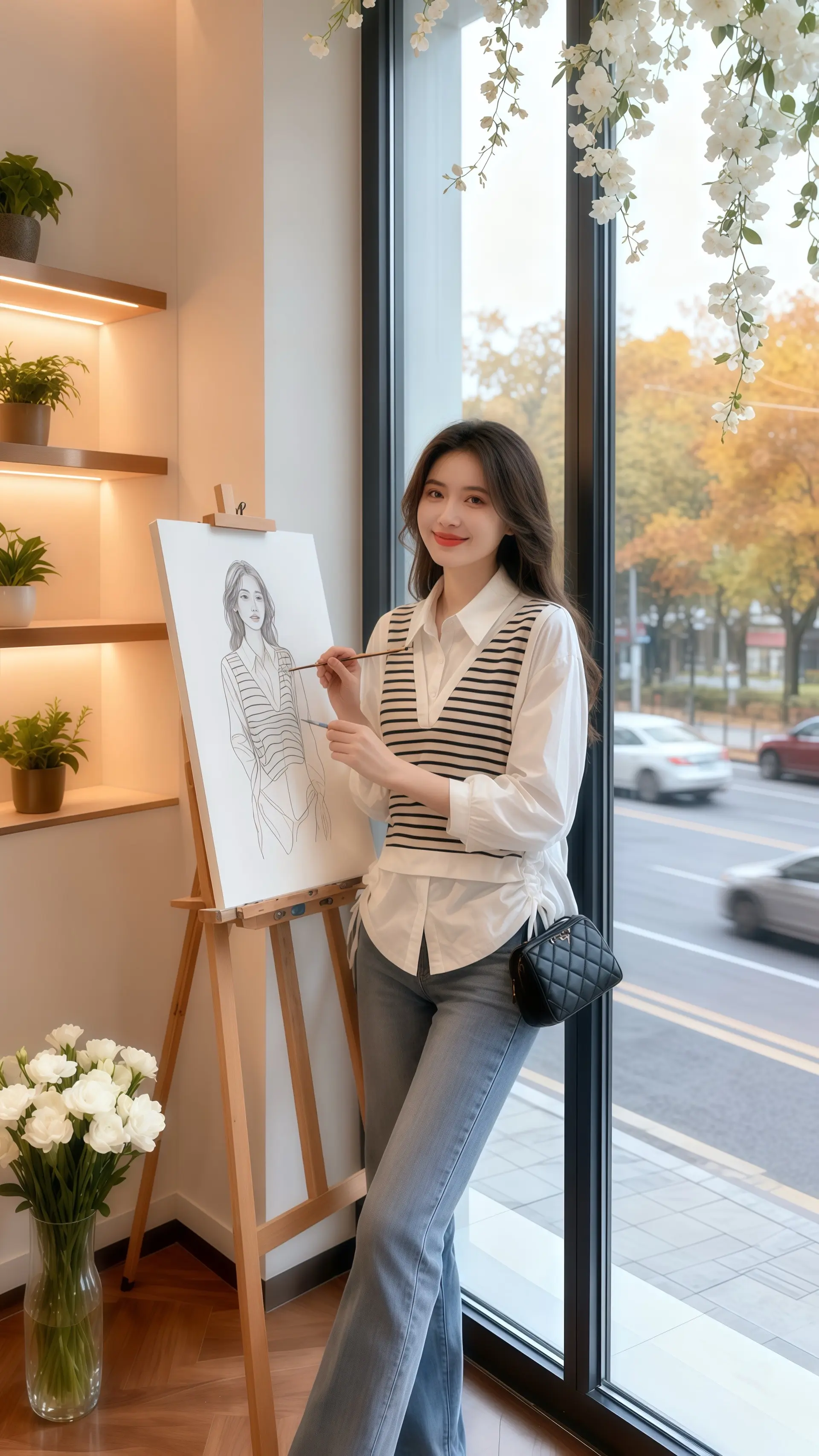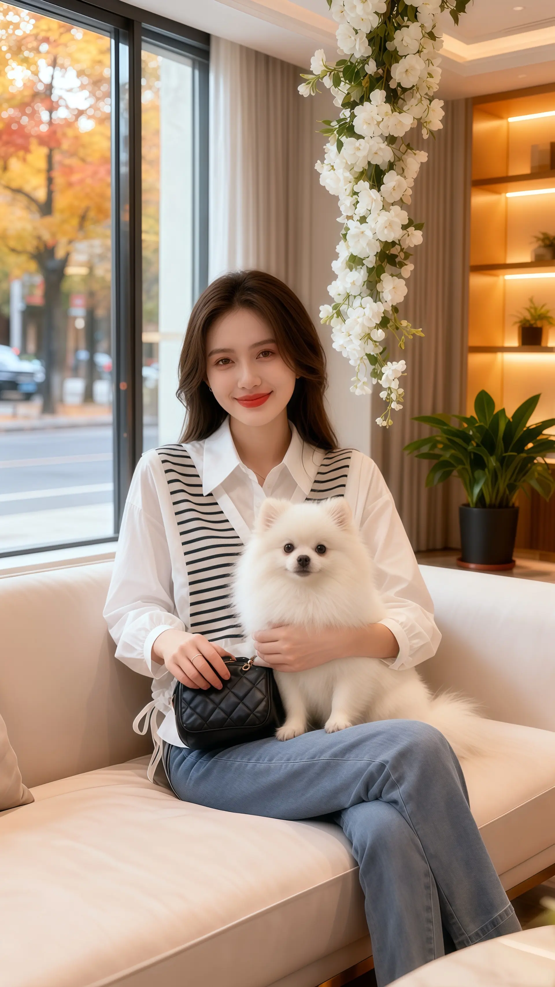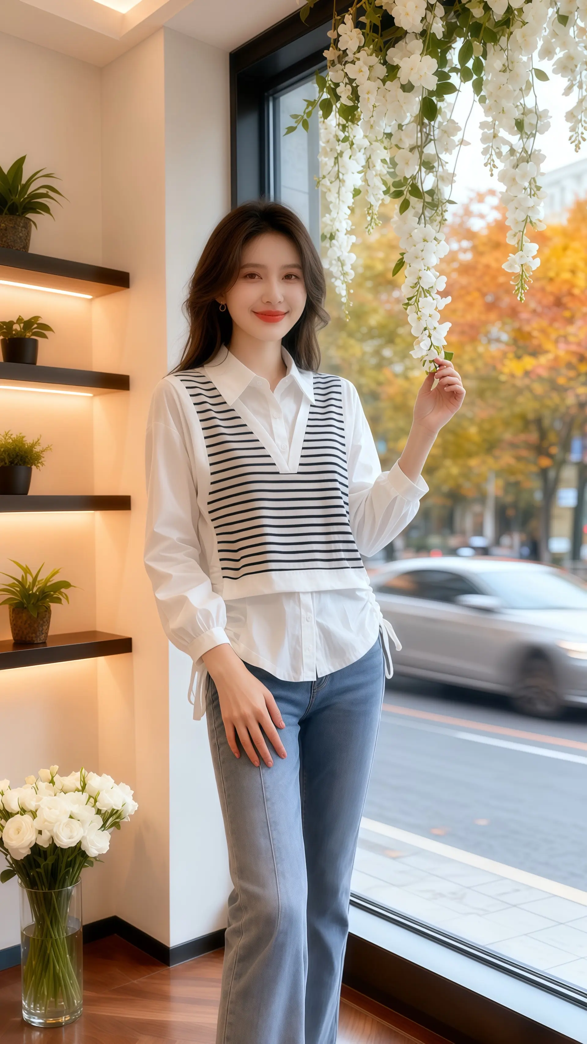 她穿着假两件条纹长袖衬衫,在秋日的温柔里演绎别样风格。黑白条纹的针织马甲与纯白衬衫的拼接设计,既有叠穿的层次感,又免去搭配的繁琐,是秋季穿搭的省心之选。温馨的室内,暖光勾勒出她的身影,窗外秋叶泛黄,街道上的汽车在朦胧景致里若隐若现,电影感的虚化街景为这一幕添了几分文艺。这件衬衫的抽绳细节灵动别致,无论是在轻奢风女装店的落地窗前驻足,还是在浅色沙发上抱着白色博美犬浅笑,都将秋日的慵懒与精致,揉进了每一个画面里,让穿搭成为季节里的温柔注脚。