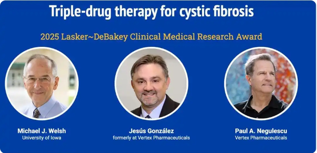 今年的拉斯克临床医学研究奖,授予了爱荷华大学的迈克尔·J·威尔士博士、曾在福泰制药任职的赫苏斯·冈萨雷斯博士和正在福泰制药任职的保罗·A·内古列斯库博士,他们三人在开发囊性纤维化的新药方面发挥了关键作用。