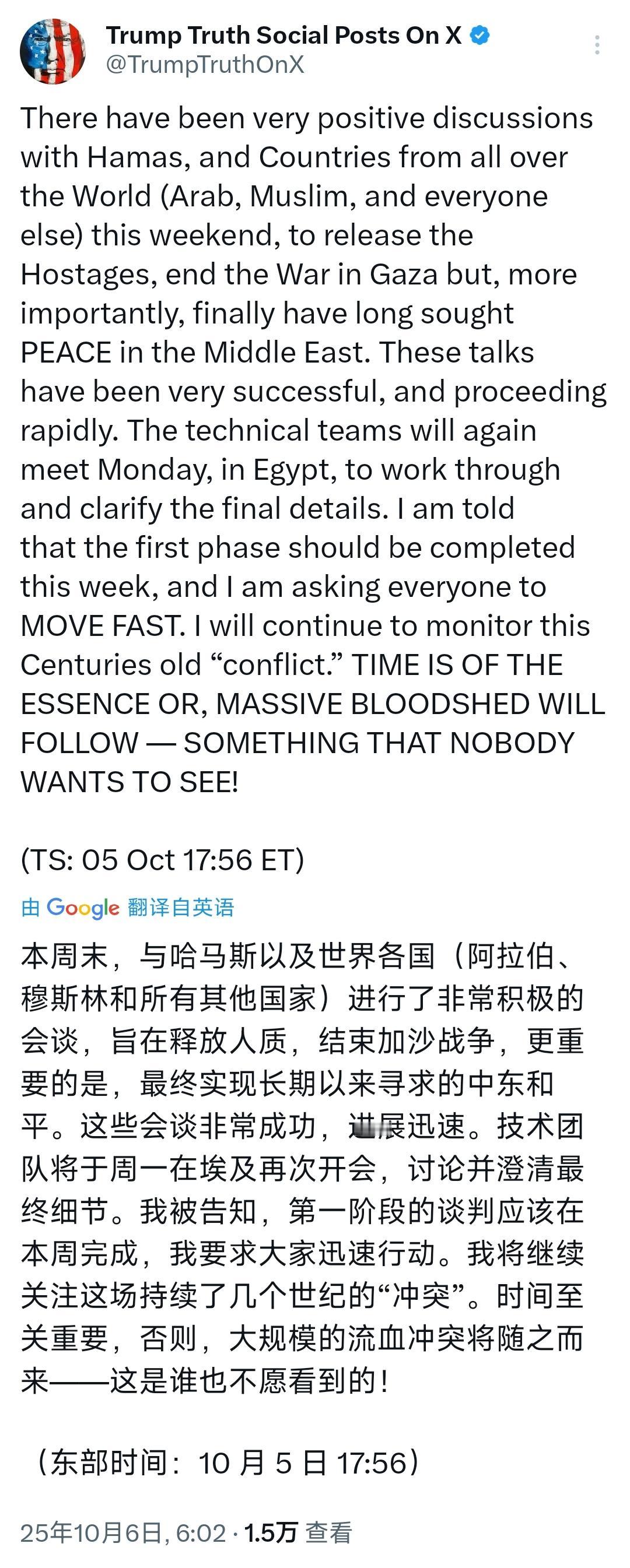特朗普一边憧憬,一边威胁。特朗普今天(北京时间10月6日)发文写道:“本周末,与哈马斯以及世界各国(阿拉伯、穆斯林和所有其他国家)进行了非常积极的会谈,旨在释放人质,结束加沙战争,更重要的是,最终实现长期以来寻求的中东和平。这些会谈非常成功,进展迅速。技术团队将于周一在埃及再次开会,讨论并澄清最终细节。我被告知,第一阶段的谈判应该在本周完成,我要求大家迅速行动。我将继续关注这场持续了几个世纪的‘冲突’。时间至关重要,否则,大规模的流血冲突将随之而来——这是谁也不愿看到的!” [机智]评几句:巴勒斯坦人能够相信特朗普和内塔尼亚胡吗?特朗普的中东政策一直被质疑为偏袒以色列,忽视巴勒斯坦权益,背后不乏经济利益驱动。其个人的自尊、权力和财富野心,恐怕才是推动所谓“和平计划”的真正动力。内塔尼亚胡所领导的以色列政府,通过军事打击哈马斯、扩张定居点等手段,不断强化自身地位,而非寻求与巴勒斯坦人的和平共处。内塔尼亚胡多次强调,不可能有巴勒斯坦国的存在。这种做法加剧了地区紧张局势,使和平进程愈发艰难。因此,任何认为特朗普和内塔尼亚胡的真正目标是实现地区和平与稳定的人,都忽视了他们背后复杂的政治、经济和个人动机。在中东这片饱经战火的土地上,和平的实现需要的不仅是表面的谈判与协议,更是各方真正的诚意与让步,而非一厢情愿的幻想。