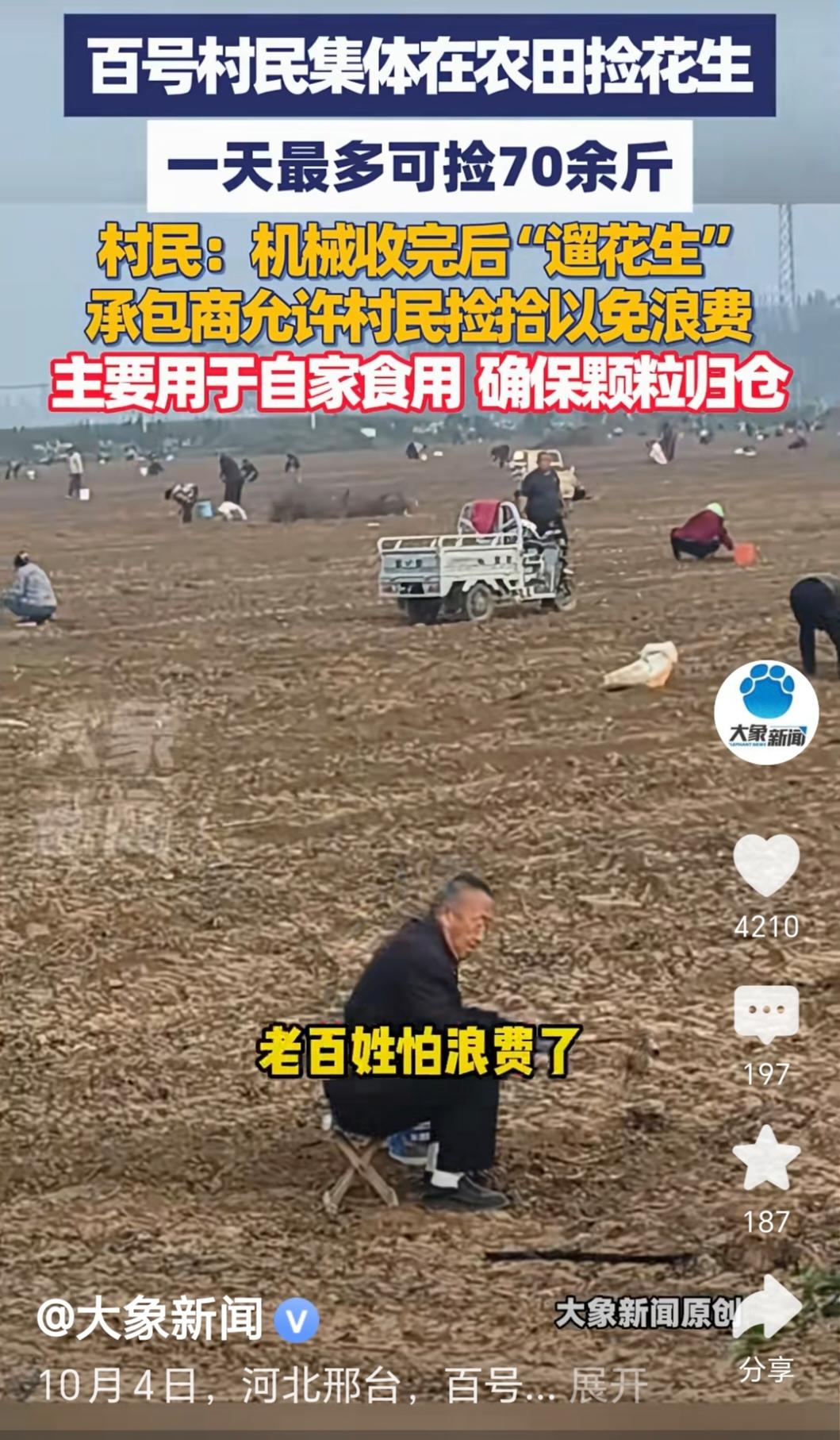 10月4日河北邢台,上百名村民集体在地里捡花生的视频火了。当地村民说,这是机械收完花生后常见的“遛花生”现象,而且承包商是允许的,就是为了避免浪费,有人一天最多能捡70多斤。这事看着热闹,却有人问:“捡别人收过的花生,算不算占承包商的便宜?会不会有法律风险?”今天就跟大家掰扯掰扯这事里的门道。 一、事件还原:百号村民地里“遛花生”,一天捡70斤不是吹的 国庆假期刚过,河北邢台一段村民捡花生的视频就刷爆了朋友圈。视频里,上百号村民拿着袋子、小铲子,在一片刚收过花生的地里弯腰忙活,有的蹲在地上扒拉泥土,有的把捡到的花生往袋子里装,场面特别热闹。 有当地村民跟拍视频解释:“这不是偷花生,是‘遛花生’,就是机械收完之后,地里肯定会落下一些,扔着也是浪费,承包商都允许我们来捡。”还说厉害的人一天能捡70多斤,自己家捡的够吃大半年,不用再花钱买了。 不少网友看了视频羡慕:“这也太实在了!既不浪费粮食,村民还能沾点实惠,一举两得啊。”但也有人疑惑:“就算是落下的,那所有权不还是承包商的吗?没经过允许捡,算不算拿别人东西?” 二、法律解读:“遛花生”到底合法不?这3个关键点要弄清 1. 承包商允许的“遛花生”,不算侵权 首先要明确:地里落下的花生,所有权一开始是属于承包商的,但如果承包商明确表示“允许村民捡”,那就相当于“放弃了这部分花生的所有权”,村民捡走不算偷,也不算侵权。 从法律上讲,这叫“所有权的放弃”,就像你把家里不用的旧衣服放楼下,说“谁要谁拿走”,别人拿走就不违法。承包商知道机械收割会有残留,主动允许村民捡,既避免了浪费,也让村民得了实惠,完全符合法律规定,没有任何风险。 2. 要是没允许就捡,可能算“不当得利” 反过来想,如果承包商没说允许,村民偷偷去捡,就可能有问题了。虽然落下的花生不多,但从法律角度看,这属于“没有合法依据,取得不当利益”,也就是“不当得利”。 要是承包商追究,村民得把捡的花生还回去,或者赔偿相应的钱。不过现实里,承包商一般不会计较这点小事,毕竟残留的花生值不了多少钱,还不如让村民捡了落个人情。 3. “遛花生”和“偷花生”,差别大了去了 很多人会把“遛花生”和“偷花生”搞混,其实两者完全不是一回事。“偷花生”是在承包商还没收割,或者明确不让动的情况下,私自去摘、去挖,这属于“盗窃行为”,要是金额大,还可能构成盗窃罪,得承担法律责任。 而“遛花生”是在承包商收割完、且允许的前提下,捡残留的花生,既不违法,也不违背道德,本质上是“变废为宝”。就像收玉米后捡玉米棒、收小麦后捡麦穗一样,都是农村常见的、不违规的事。 三、网友热议:羡慕归羡慕,这事得客观看 视频火了之后,网友们的评论特别有意思,主要分两派: “羡慕派”:这才是不浪费的好风气! 不少网友说:“我们老家以前也这样,收完庄稼捡残留的,既能省点钱,还不浪费粮食,比扔在地里烂了强多了!”还有人调侃:“一天70斤,这效率也太高了,我也想去邢台‘遛花生’!” “理性派”:关键在“允许”,别乱捡惹麻烦! 有些网友提醒:“别光看热闹,要是承包商没允许,可别随便去捡,不然容易闹矛盾。”还有人结合法律说:“之前看过有人偷收完的红薯被追责,虽然量少,但毕竟没经过同意,还是得注意边界。” 也有农村网友补充:“现在农村‘遛庄稼’很常见,承包商一般都愿意让捡,一是省得自己清理,二是能和村民处好关系,只有少数惜力的承包商才会不让捡,但也很少追究。” 结论:“遛花生”捡的是实惠,守的是规矩!你怎么看? 邢台村民“遛花生”这事,看着是件小事,却藏着“不浪费、守规矩”的大道理。村民没乱捡,等承包商收完、得到允许才动手;承包商也大方,宁愿让村民捡走残留,也不浪费粮食。这种双方都乐意的事,既暖心又合规。 但也有人说:“现在生活条件好了,没必要再捡这点花生,费时费力。”还有人担心:“要是有人借着‘遛花生’的名义,偷偷多捡或者破坏田地,就不好了。” 最后想问问大家:你老家有“遛庄稼”的习惯吗?你觉得“遛花生”是节约还是没必要?如果遇到承包商不允许捡的情况,你觉得村民还能去捡吗?欢迎在评论区聊聊你的看法!
