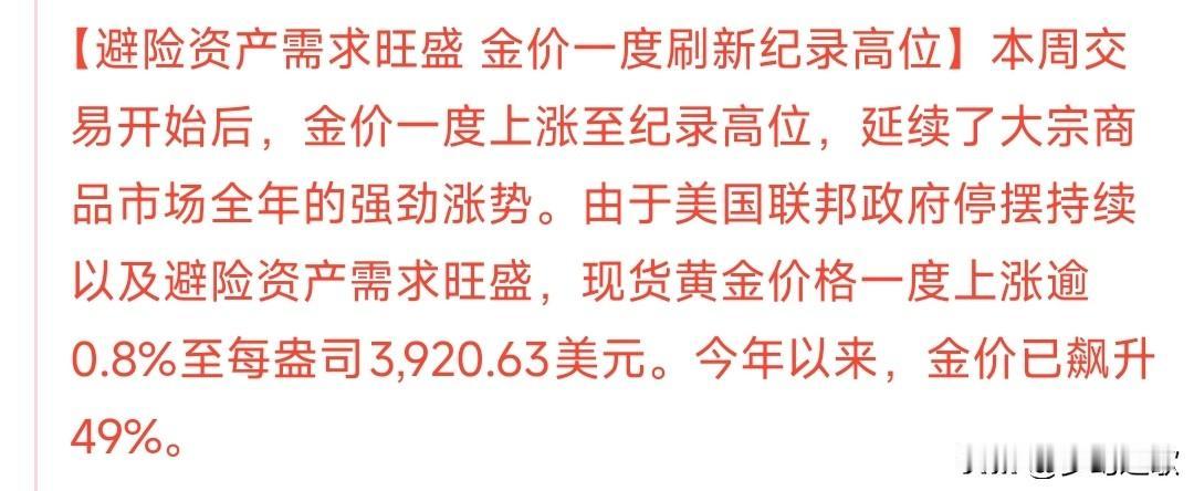 美国政府一停摆,黄金直接“上天”了,比特币更是直线上涨 现在避险资金都在找各种保值资产避险,因为美国政府停摆,美元指数下跌,美元贬值,而资金现在选择的最大的两个渠道就是黄金和虚拟货币,黄金今天已经涨到了3920美元,比特币更是突破了12.5万美元。 目前美国政府什么时候复工还不确定,如果复工时间一直不能确定,国会提出的法案还是不能通过,这两种资产还会接着涨,这就是恐慌引起的效应。 黄金上涨,虚拟货币上涨,中东冲突平息,这个十一真是事情不断,不过对于股市都是好消息。