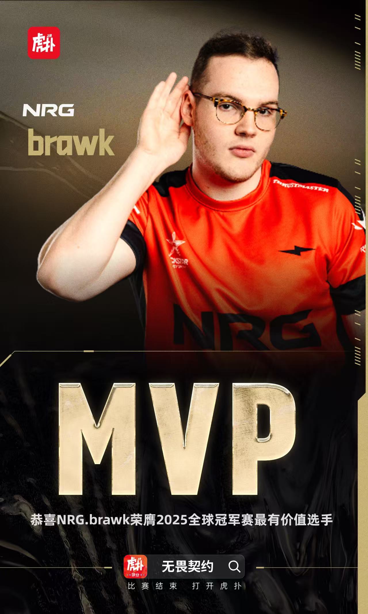 虎扑10月06日讯在今天结束的2025年巴黎全球冠军赛总决赛中,NRG拒绝让二追三,在图五惊险取得胜利。而在整个冠军赛期间表现极为优异的brawk,斩获了本届赛事的MVP。他用奥丁呈现了他近乎完美的地图理解,在攻防两端都为NRG提供了极其强大的火力!