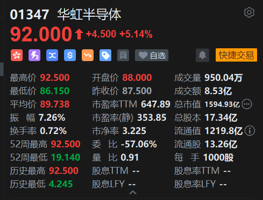 10月6日消息,华虹半导体港股涨幅扩大超5%,再创历史新高,公司21个交易日股价翻倍。截至发文,华虹半导体涨5.14%,报价92港元,成交额逾8亿港元。