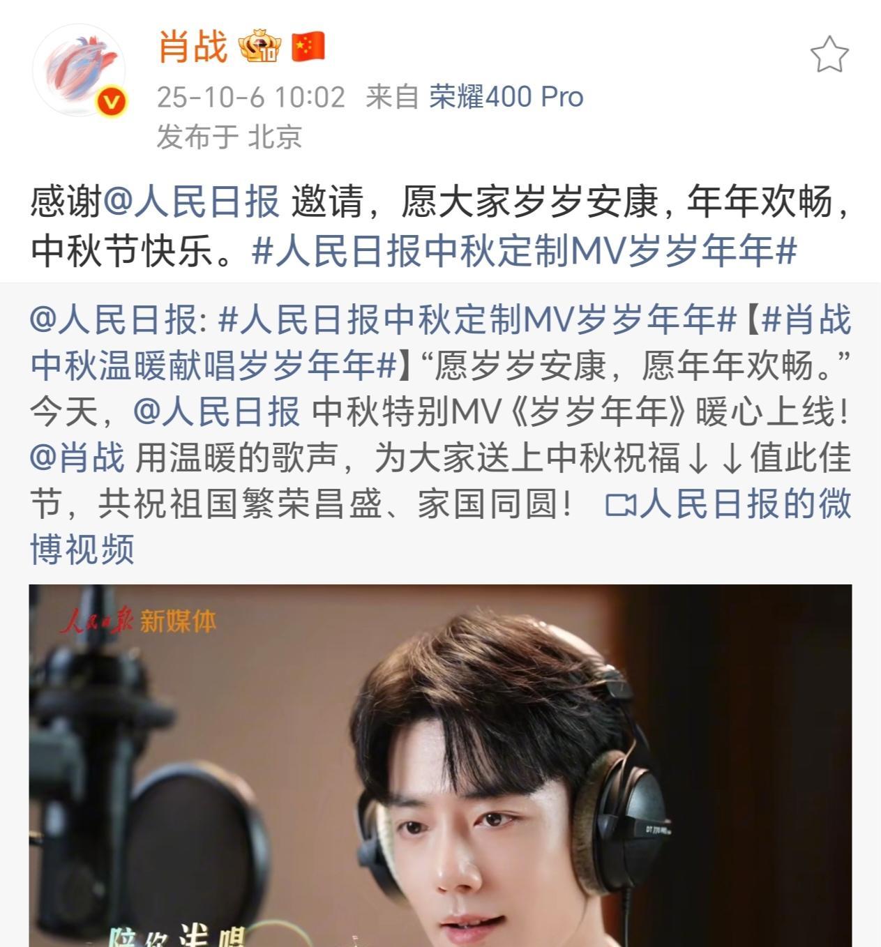 肖战这首《岁岁年年》是人民日报为中秋节定制的啊。好喜欢这首歌啊,他温柔而坚定的歌声如流水般淌入了我的心里。