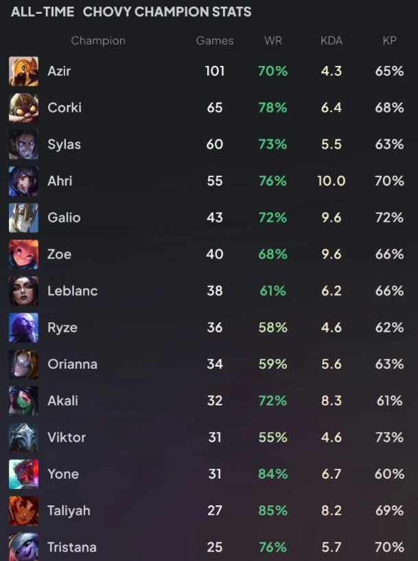 Chovy英雄使用情况:沙皇101场70%胜率,飞机65场78%胜率