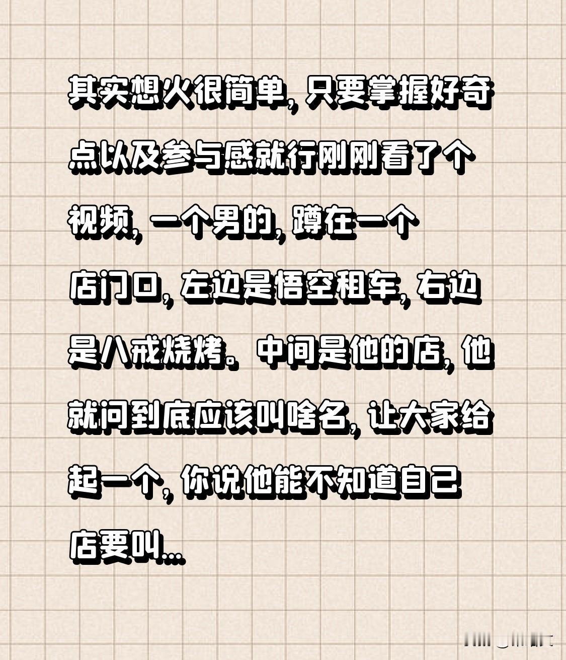 其实想火很简单,只要掌握好奇点以及参与感就行 刚刚看了个视频,一个男的,蹲在一