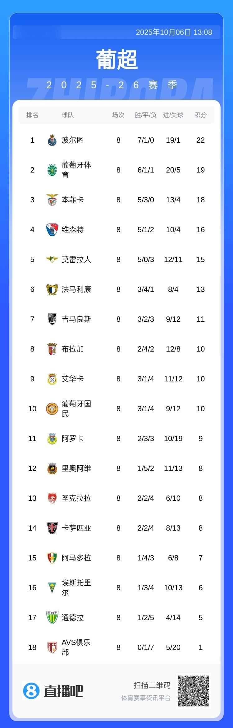 在目前葡超积分榜上,波尔图积22分居首,葡体19分次席,穆里尼奥执教的本菲卡以18分第三。