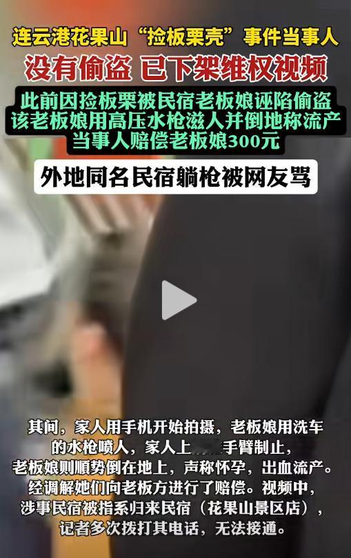 这不是虚假宣传吗? 官方说去了花果山板栗随便捡,结果一游客就因为好奇捡了个板栗壳捡出一顿窝囊气来。 近日,一位去连云港花果山游玩的游客,看见地上有几个板栗壳没见过,出于好奇捡起来了,结果立马冲出来一个自称归来民宿老板的女人,张嘴就骂游客是小偷,还说所有的板栗都是他们家的, 双方开始争执,互吐口水。结果老板直接抄起高压水枪,对着人呲,游客推了一下胳膊,她立马躺地上开始表演了,自称是孕妇,然后被打出血了。 结果旁边他们家的人呢,一个比一个淡定。这女人在景区上班的父亲还叫景区的工作人员过来查人家的门票。接着老板娘打滚起来之后,又用手肘开始打别人。 在警察叔叔面前还要人家赔2000块钱,最后经过协调,硬是让游客赔了300块钱的营养费。 就说这花果山的板栗到底能不能捡?不能真捡了还赔300,这以后谁改敢去? 还有这个女老板真怀孕了吗?