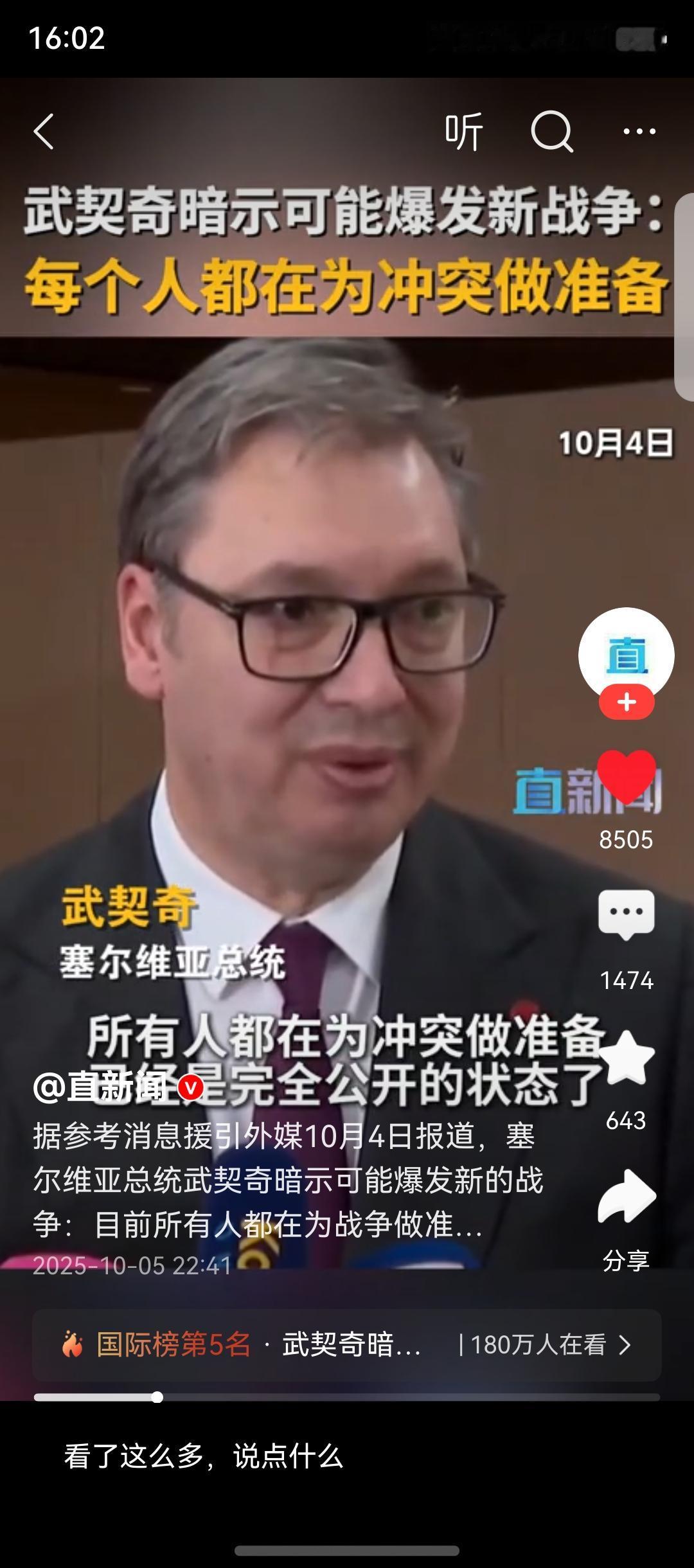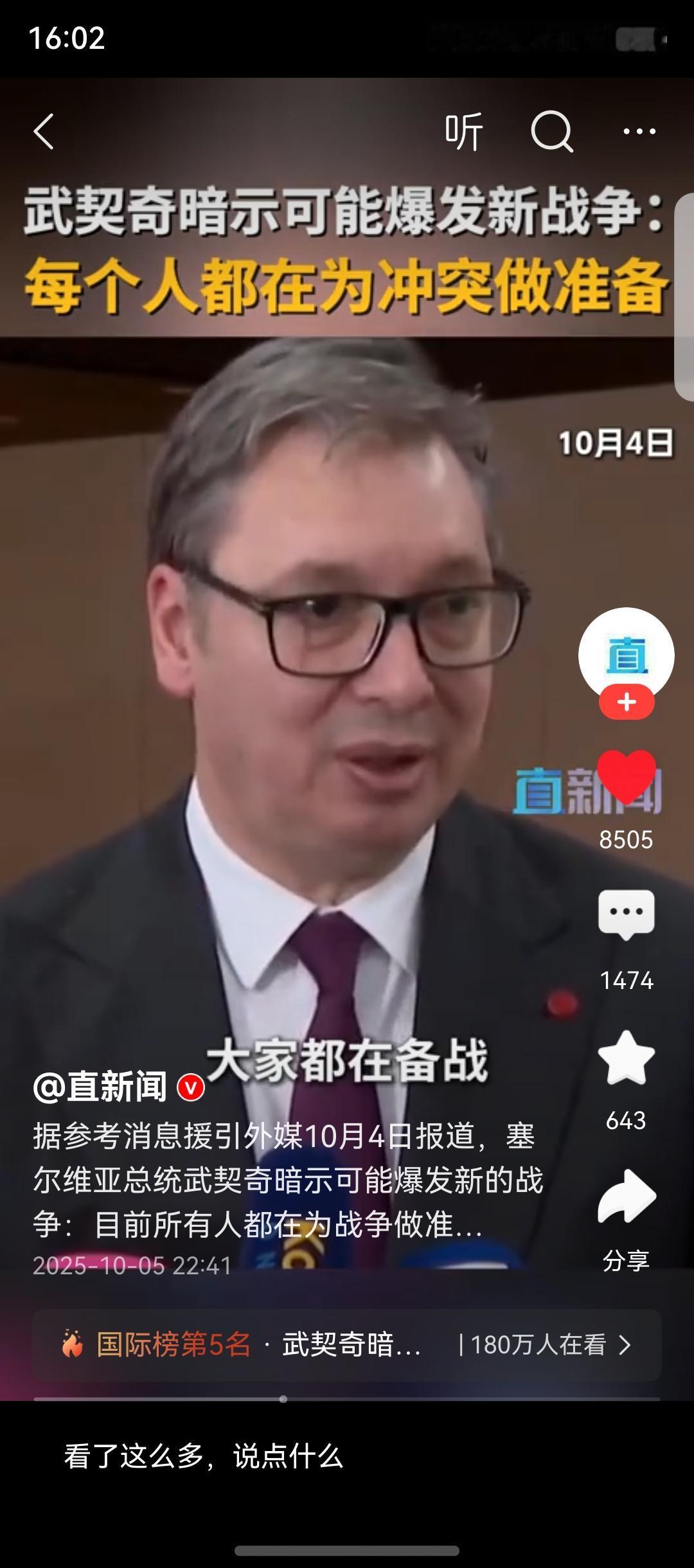 武契奇都这么说了,很多大V也都看出来了,战争不是要停止了,而是很可能扩大。 结合前几天,俄罗斯新征120万士兵,乌克兰跟美国要战斧,美军加油机进驻卡塔尔乌代德空军基地...... 种种迹象表明,接下来很可能会有大规模的冲突。 不是较大规模,而是大规模。 对了,还有英国公开承认,已经与俄罗斯在进行混合战。 至于这个混合战,包括哪些领域,英国没具体说。