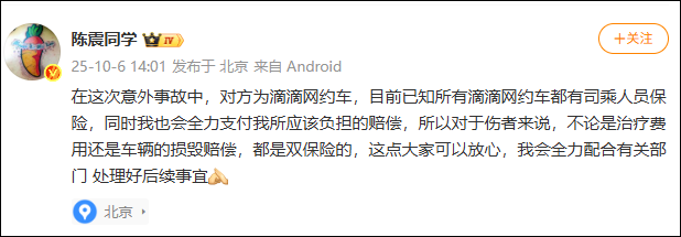 “在这次意外事故中,对方为网约车,网约车的司乘人员一般都有保险,同时我也会全力支付我所应该负担的赔偿,所以对于伤者来说,不论是治疗费用还是车辆的损毁赔偿,都是双保险的,这点大家可以放心,我会全力配合有关部门处理好后续事宜。”