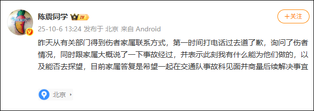 陈震车祸伤者委托律师诉讼,陈震再道歉,并称“我方律师会全力配合”
