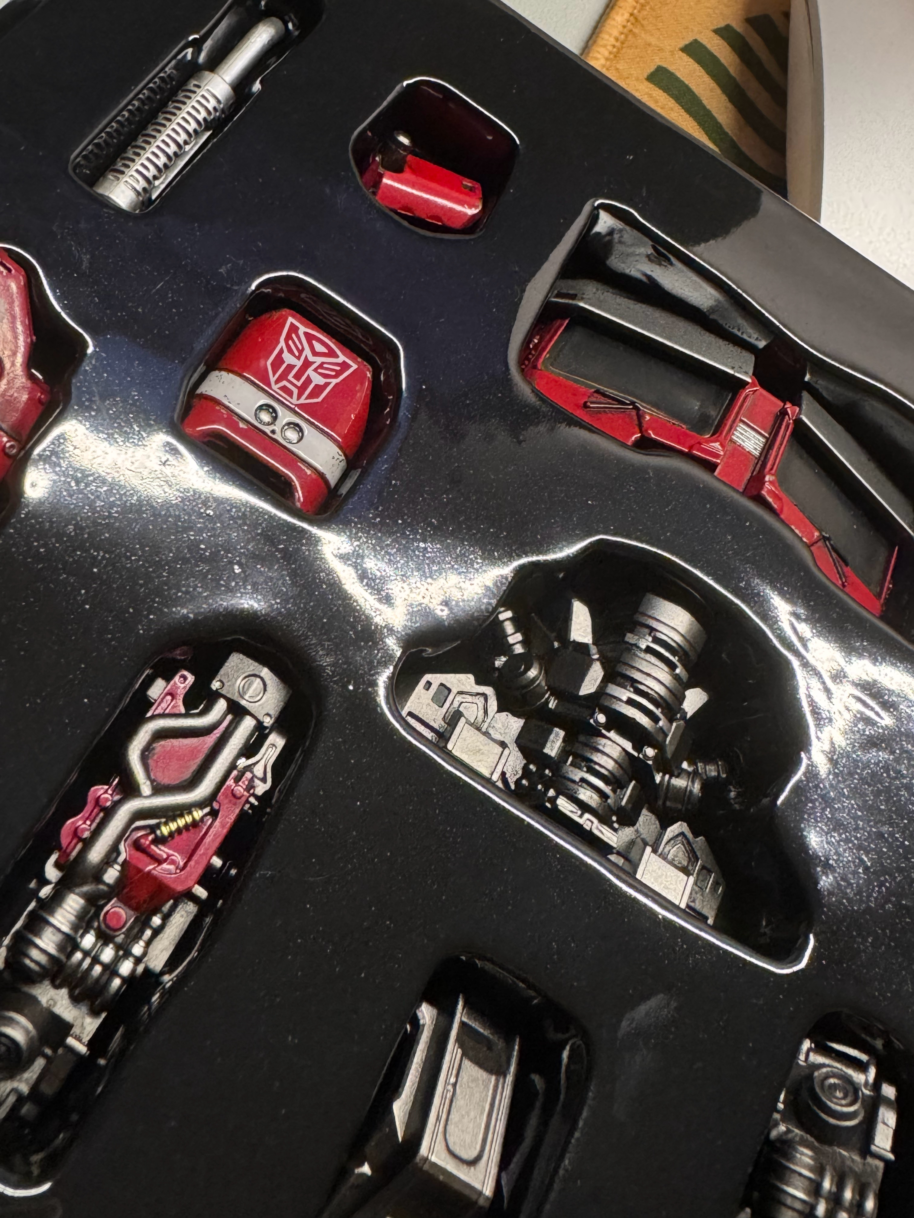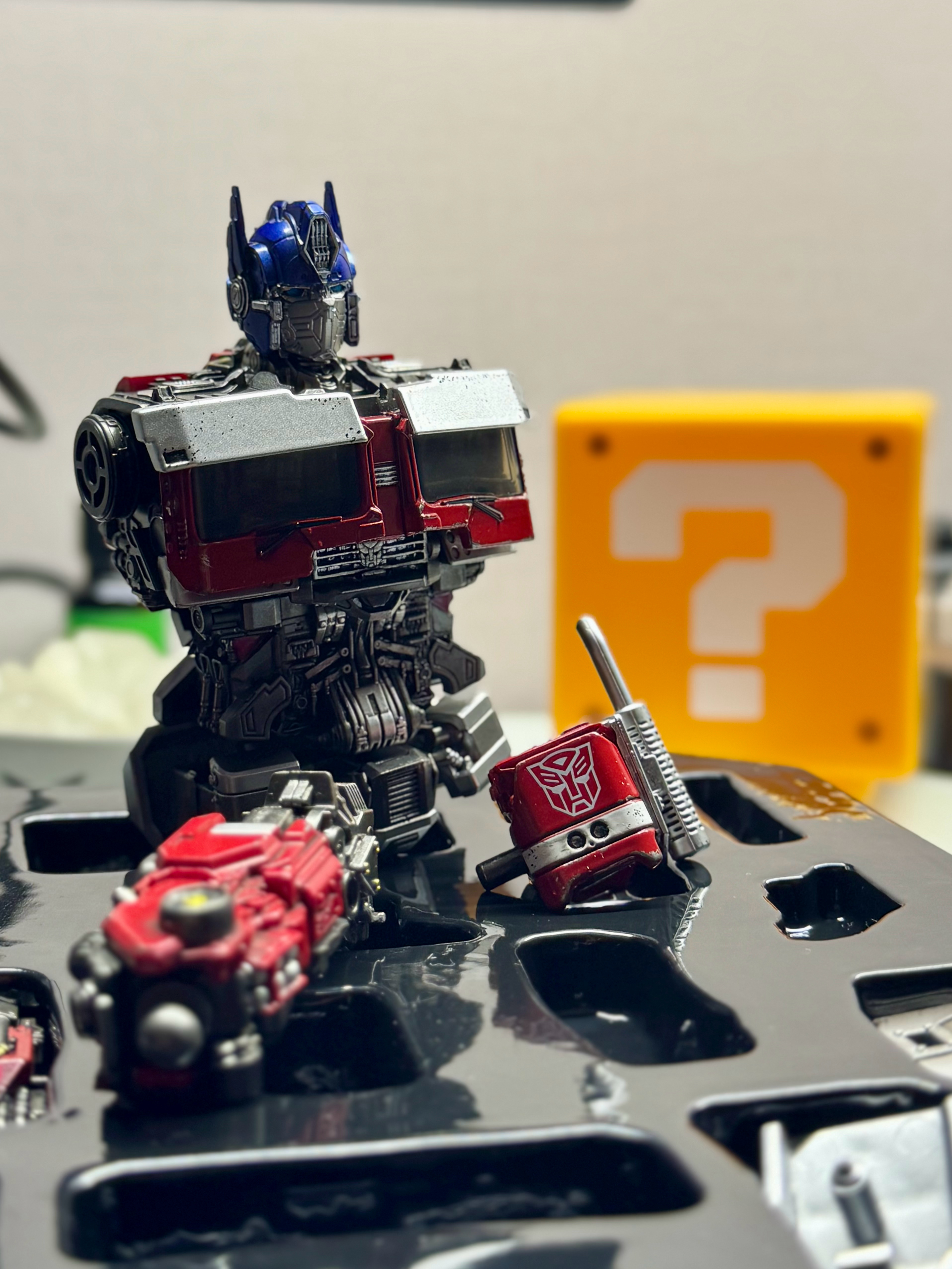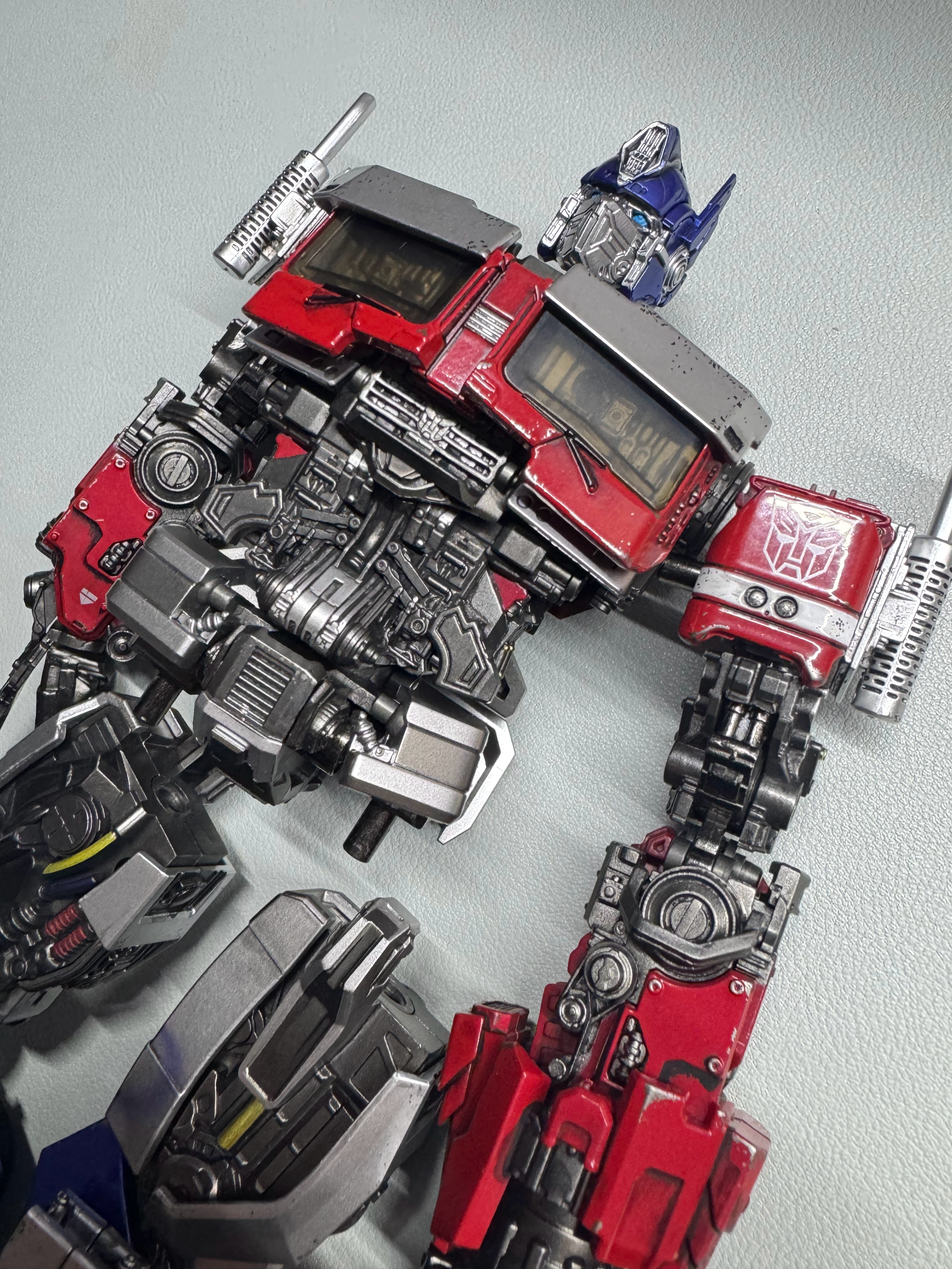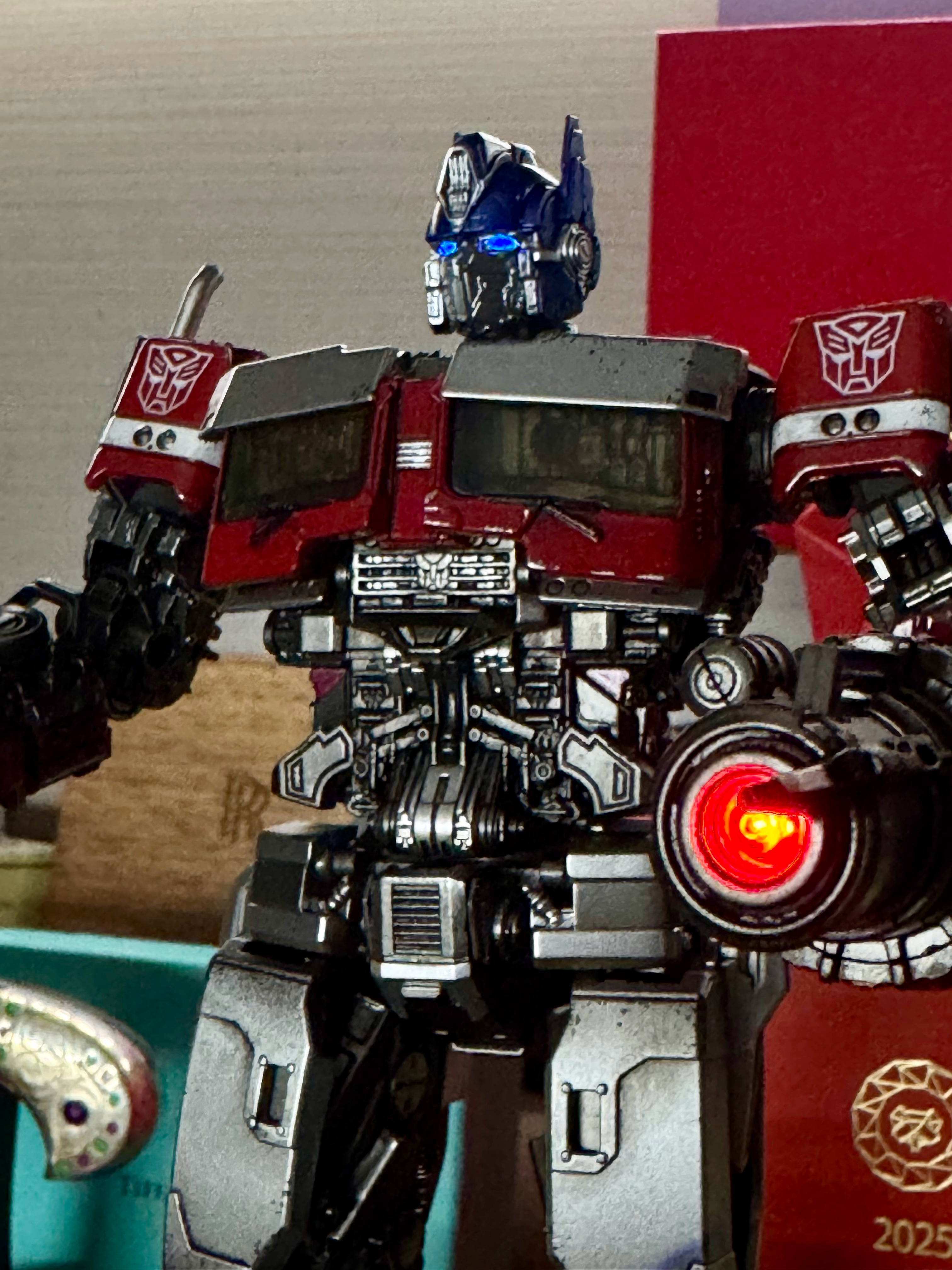 组装了一个战损版 G1 擎天柱40周年纪念版,合金+塑胶主体材质,火炮和眼睛可点亮。