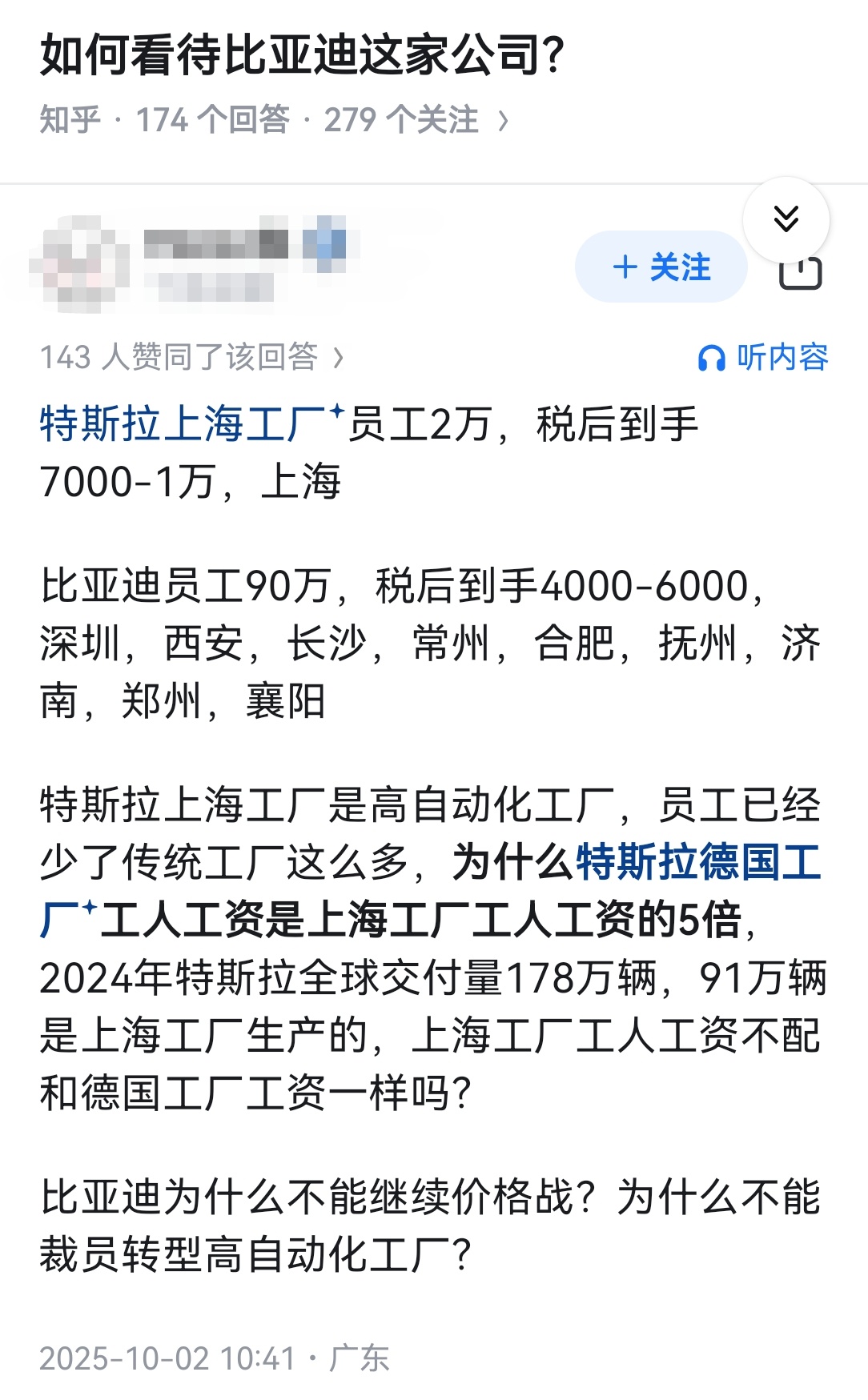 用户13xxx59 2 2025-10-06 21:55 我最近就在上海比亚迪出差,里面很多7-12k的,还包住。不知道为啥被黑的这么惨 用户13xxx59 回复 10-06 21:58 而且特斯拉21-23年,三年交的税加起来才100亿,比亚迪去年一年就交了500多亿,比特斯拉三年加起来还多5倍。特斯拉才提供了几万的岗位,比亚迪却提供了上百万的工作岗位,真的没有对比就没有伤害