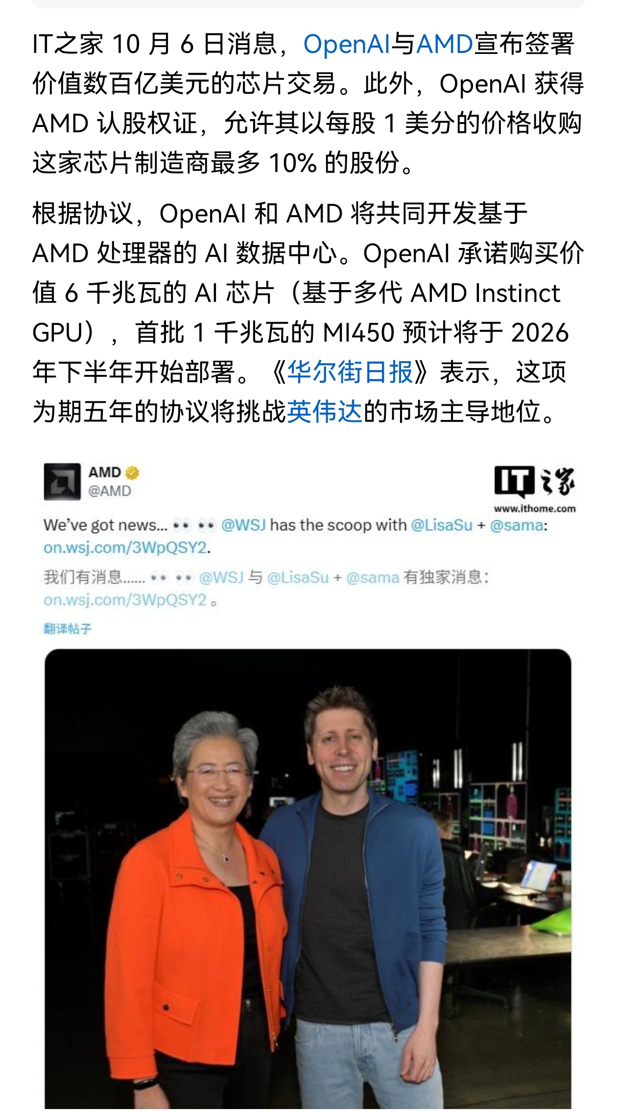 openai真是资本运作高手,前段时间才把甲骨文拉了三十五个点,这又把amd拉三