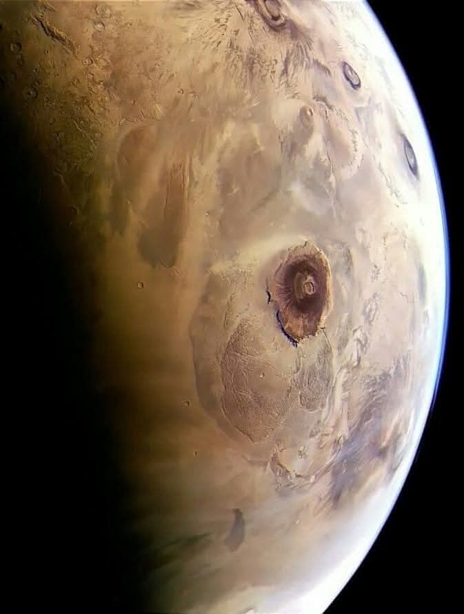 这是太阳系中最大的火山,名为奥林匹斯山,直径 650 公里,山顶高出周围平原 22 公里。如果你在山顶,你将看不到山脚,因为它会延伸到地平线之外。