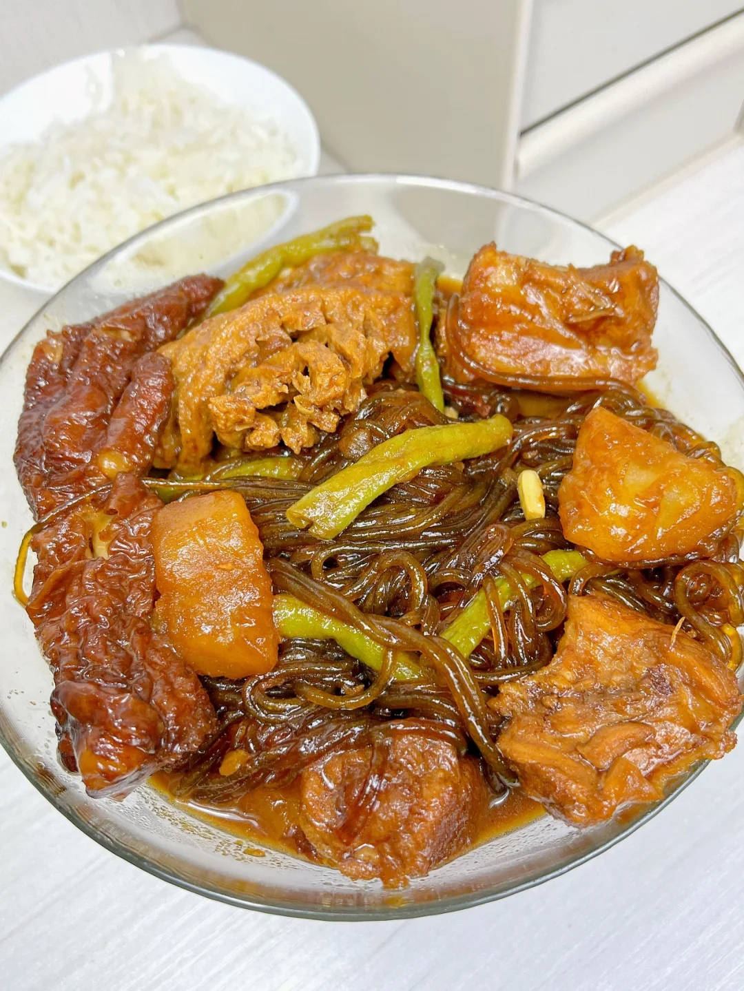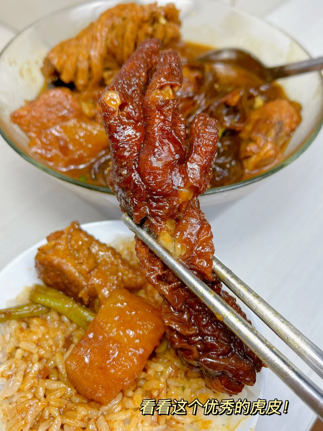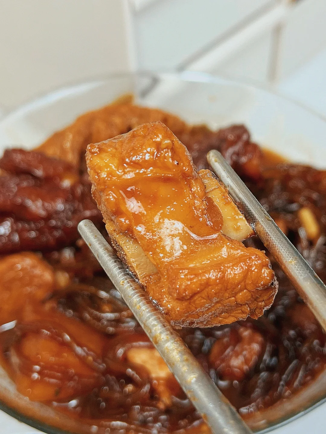 真的太香了,我妈妈炖这个的时候,邻居路过还敲门问了我家到底在做啥,这么香😭排骨直接软烂住了,土豆真的入口即化,凤爪没指甲可以直接炖,一抿就脱骨,肥肥糯糯个儿还贼大的,卤香味贼好吃!还有粉丝!记得多放点,浸着汤汁好好吃😭