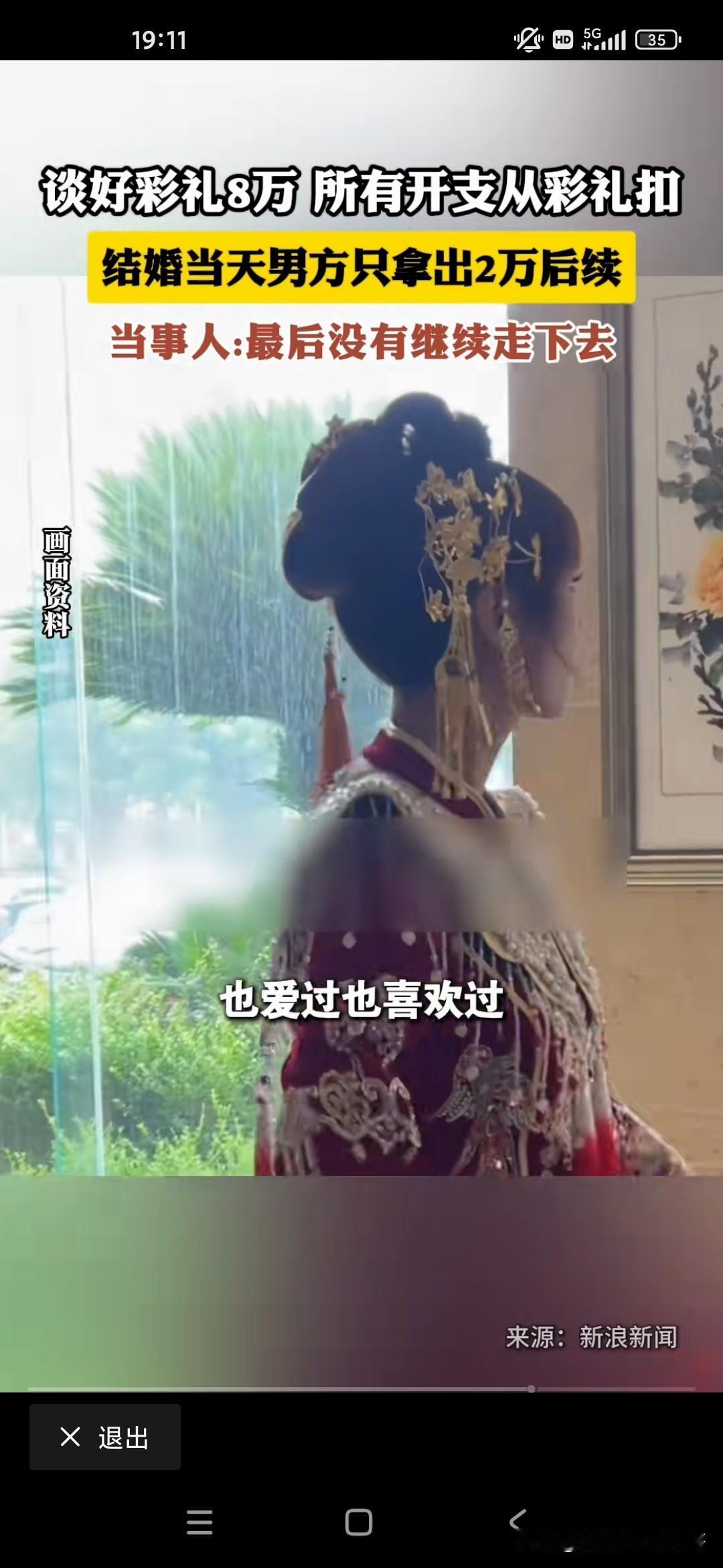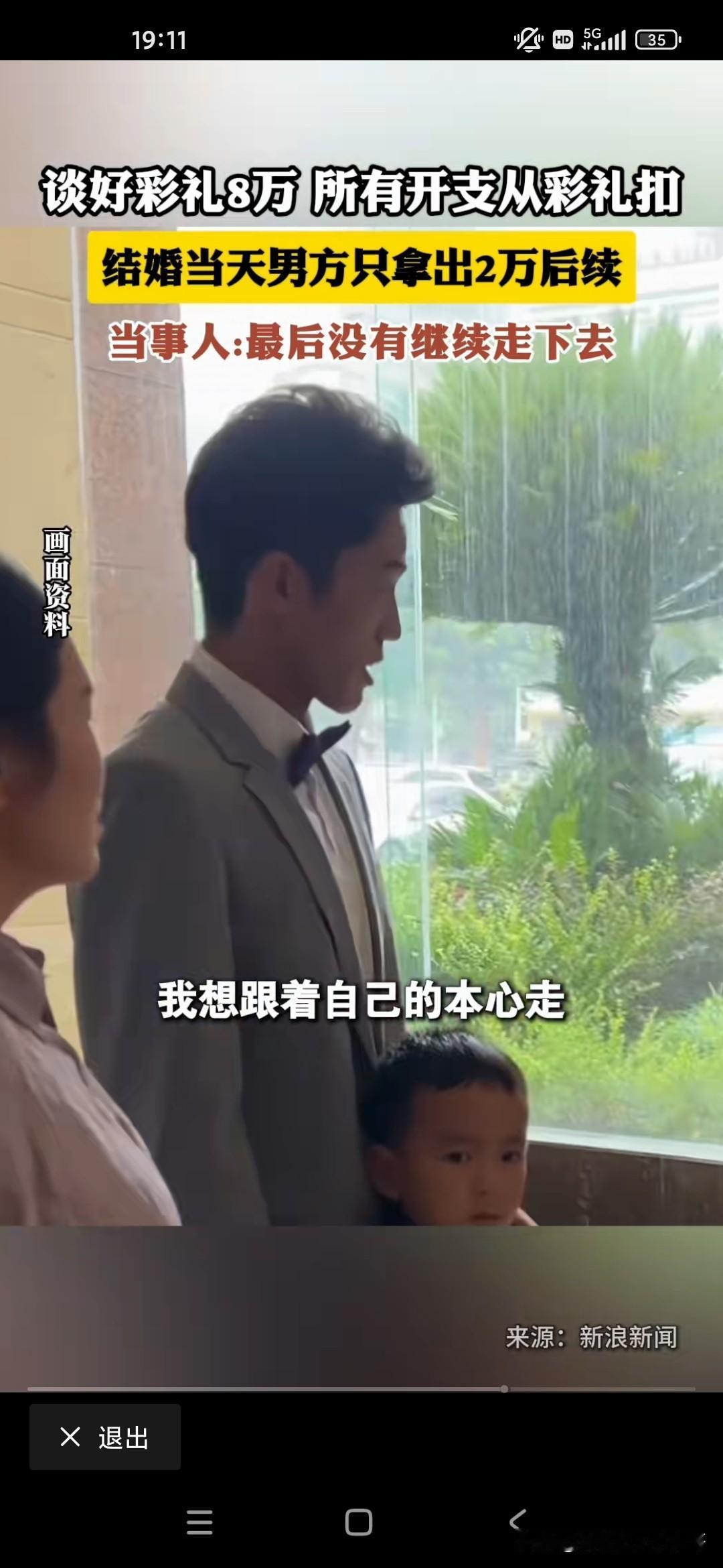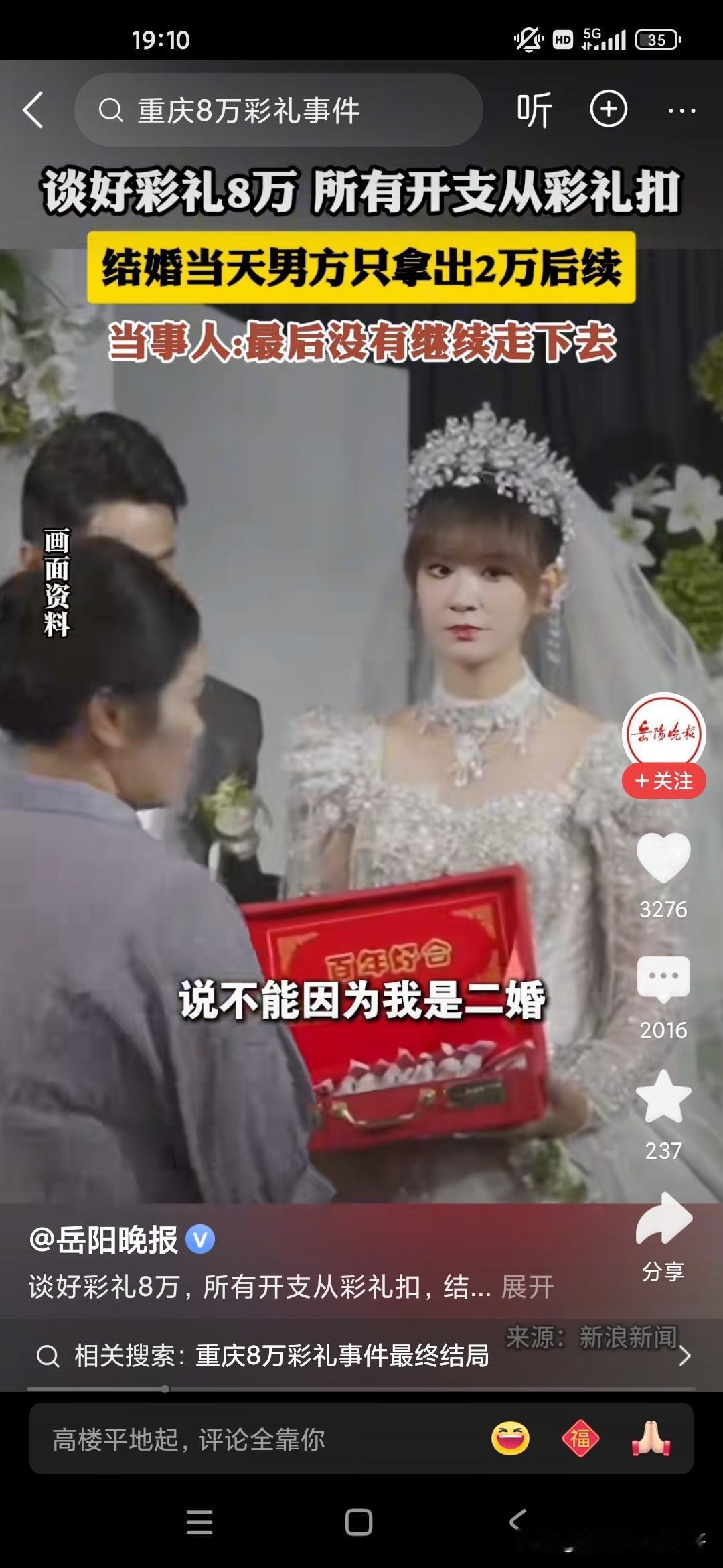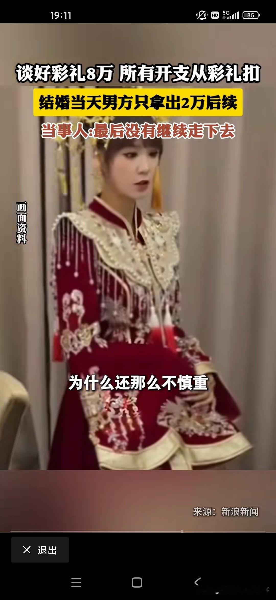 现在的二婚甚至三婚女子要求越来越高了,呃,也可能是因为头婚的时候,她们还不知道自己要什么,但是当二婚三婚的时候,她们已经恍然醒悟,所以说她们不仅追求有物质生活,还要追求有精神方面的富足,因此的话,很多男人没有结过婚的,可能会觉得女人要求怎么这么高,你不就是二婚吗?你还是三婚,在中国的传统社会都是不入流的,但是没有想到正是因为二婚三婚,她对婚姻看的非常透彻,她对于生活的理解更加深沉一些,所以说她才会那么挑剔,你看视频中的这个女子虽然是二婚,但是对于彩礼要求仍然是8万,这个男生耍心眼儿,说好的8万,最后改为2万,她就非常生气,她觉得男生不尊重他,男生的家人没有征求她的意见!就是希望在结婚当天的话给她难堪,逼她就范,但是没有想到她这么刚烈,最后坚决退婚。所以说我觉得大家最好在结婚之前的话就商量好,男生如果既然答应的话,那就要守信用,这样的话,这个老婆才会跟他好好过日子,要不然的话都是隐患!