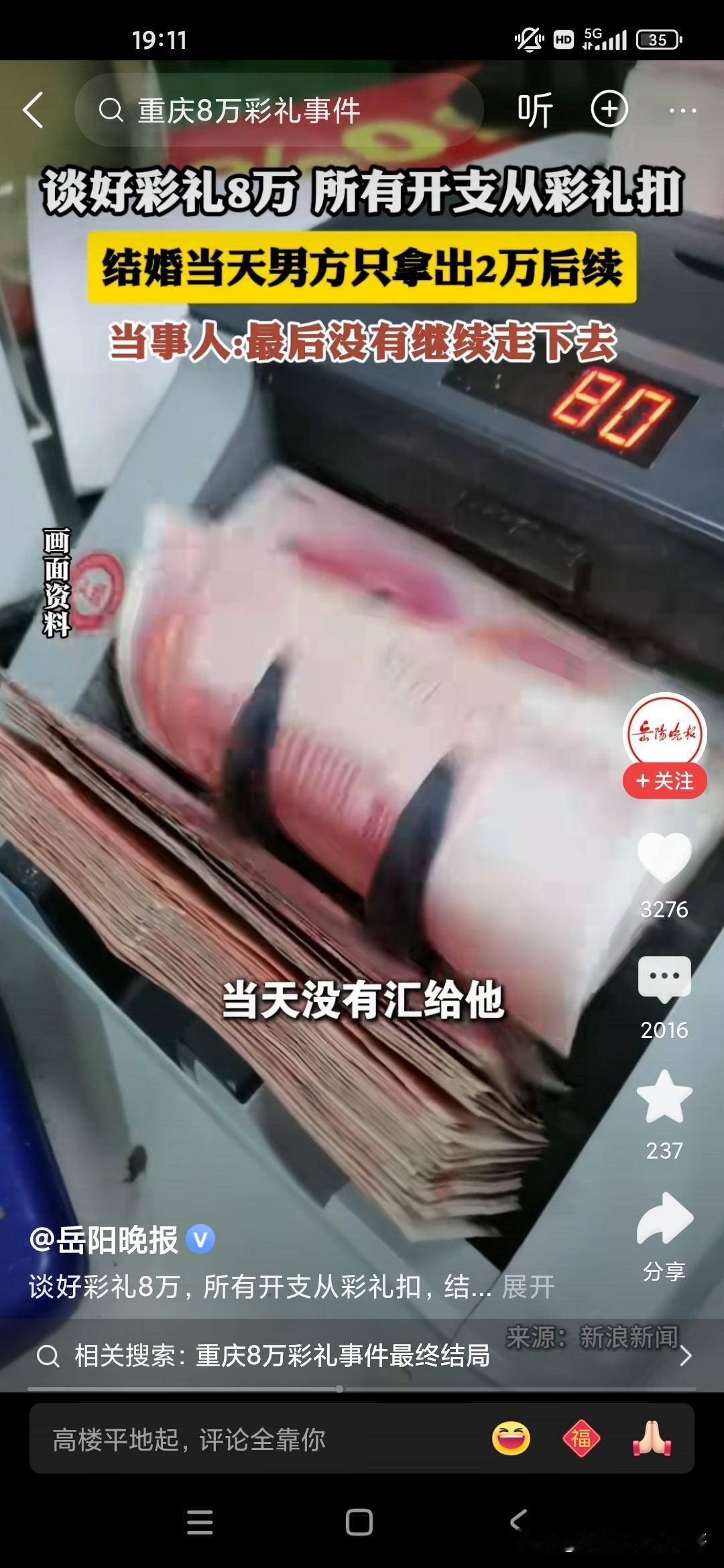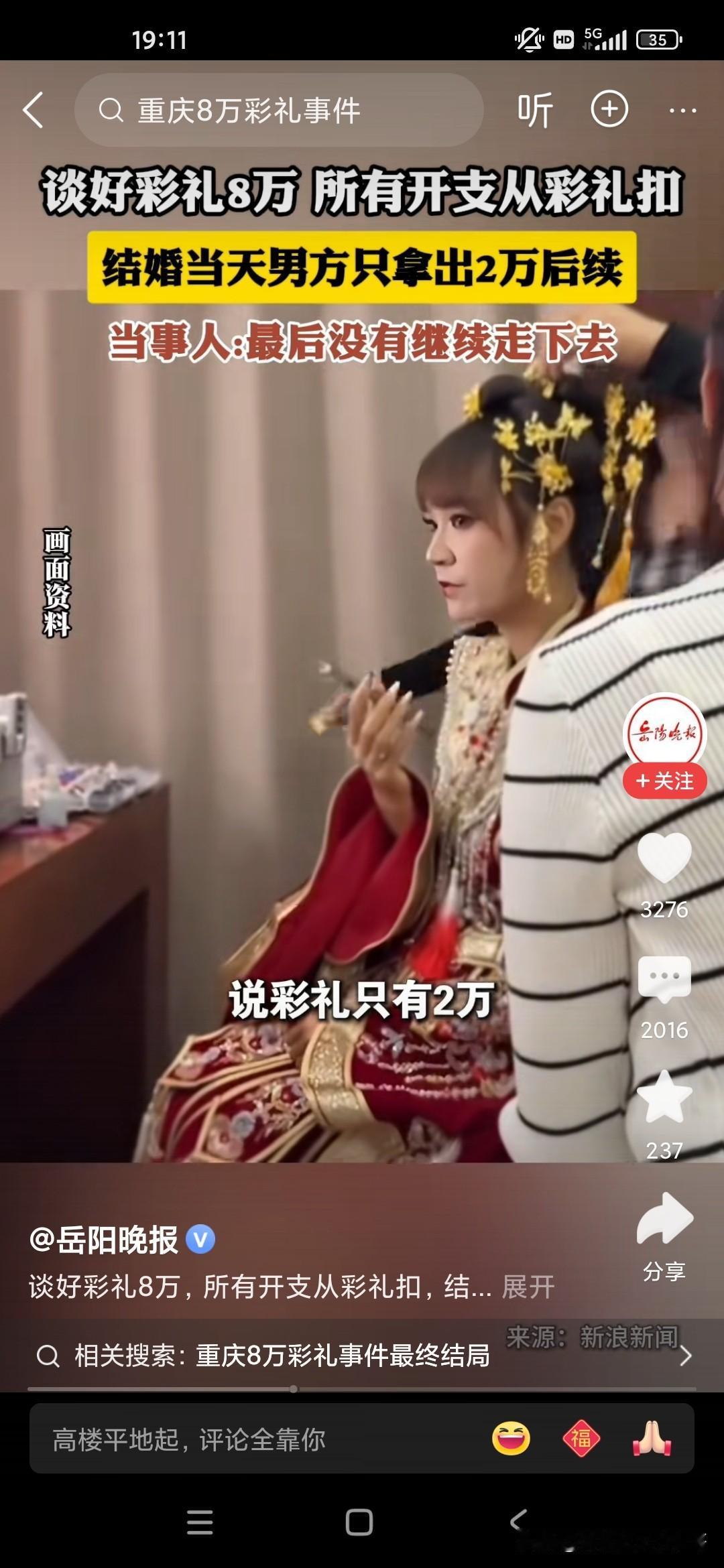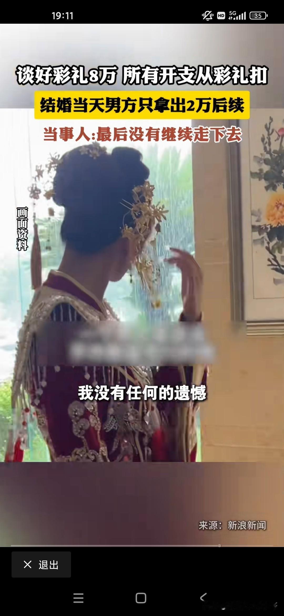 现在的二婚甚至三婚女子要求越来越高了,呃,也可能是因为头婚的时候,她们还不知道自己要什么,但是当二婚三婚的时候,她们已经恍然醒悟,所以说她们不仅追求有物质生活,还要追求有精神方面的富足,因此的话,很多男人没有结过婚的,可能会觉得女人要求怎么这么高,你不就是二婚吗?你还是三婚,在中国的传统社会都是不入流的,但是没有想到正是因为二婚三婚,她对婚姻看的非常透彻,她对于生活的理解更加深沉一些,所以说她才会那么挑剔,你看视频中的这个女子虽然是二婚,但是对于彩礼要求仍然是8万,这个男生耍心眼儿,说好的8万,最后改为2万,她就非常生气,她觉得男生不尊重他,男生的家人没有征求她的意见!就是希望在结婚当天的话给她难堪,逼她就范,但是没有想到她这么刚烈,最后坚决退婚。所以说我觉得大家最好在结婚之前的话就商量好,男生如果既然答应的话,那就要守信用,这样的话,这个老婆才会跟他好好过日子,要不然的话都是隐患!