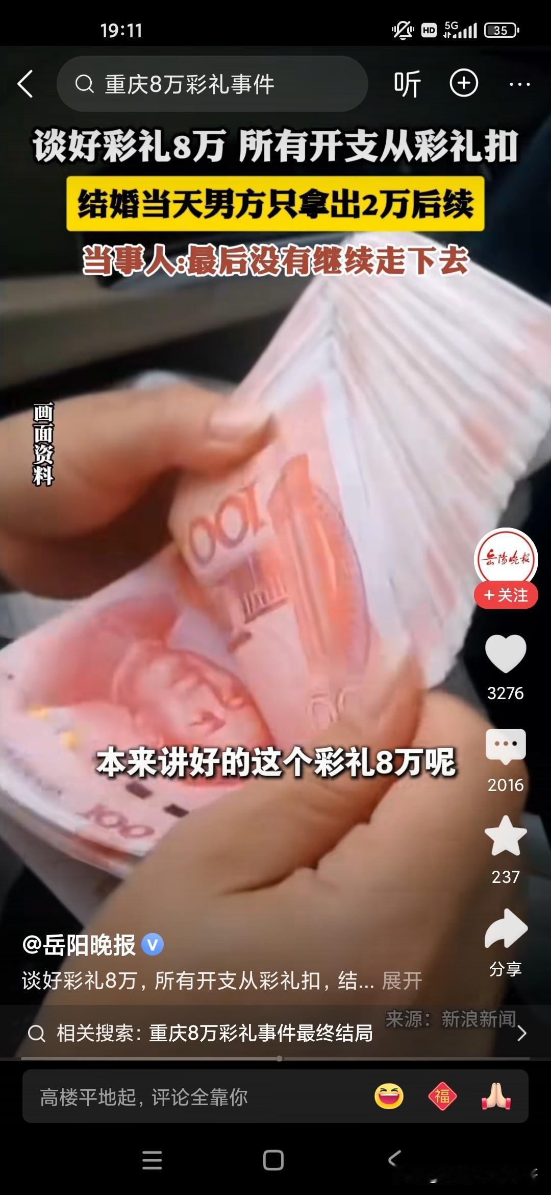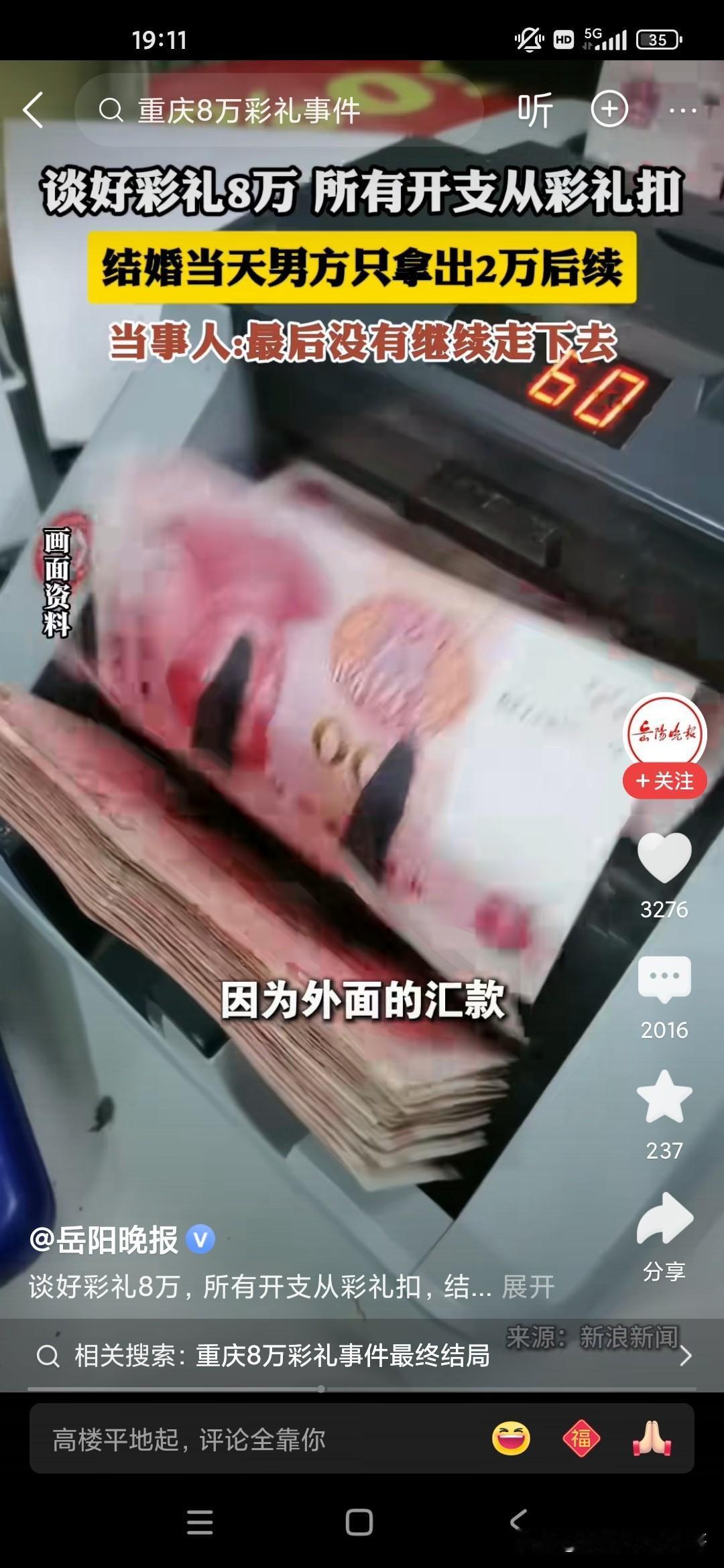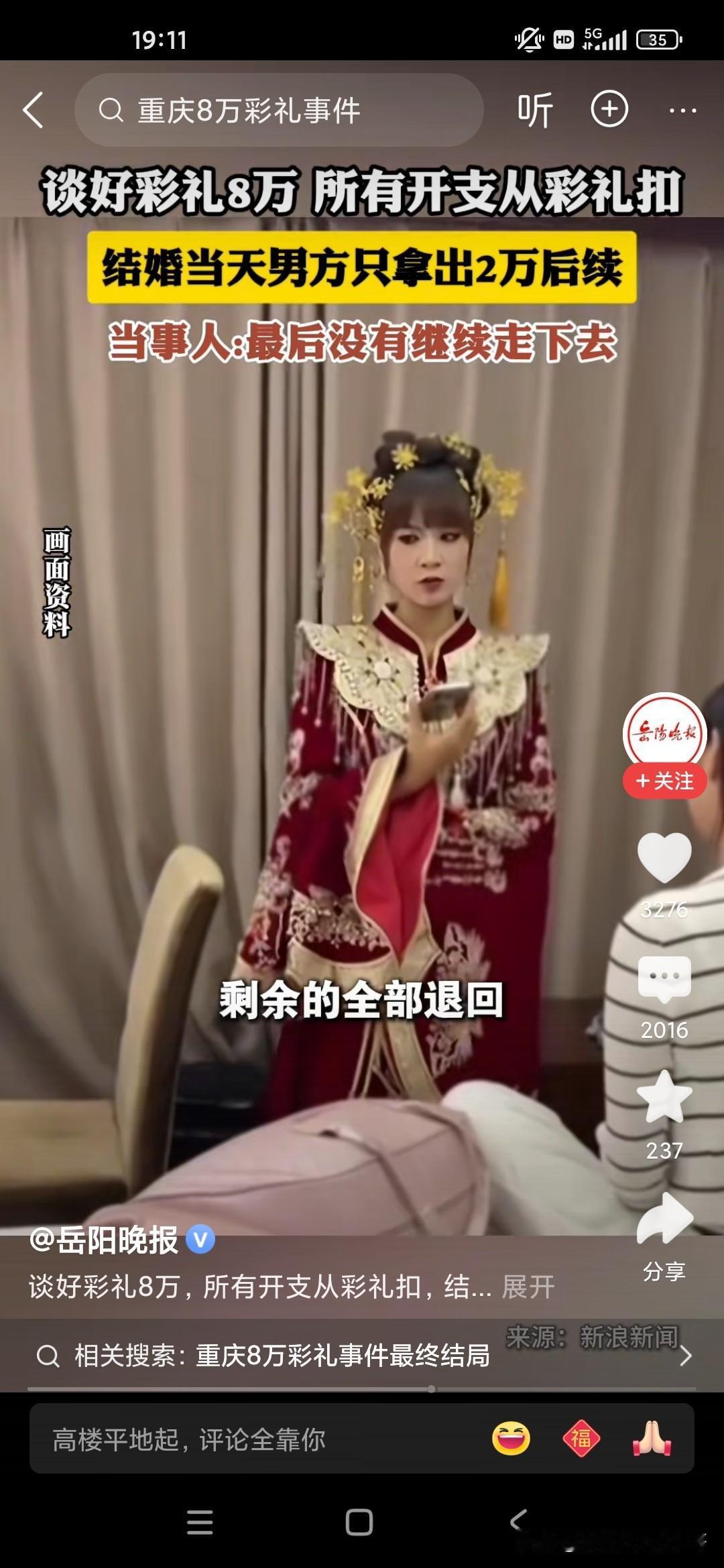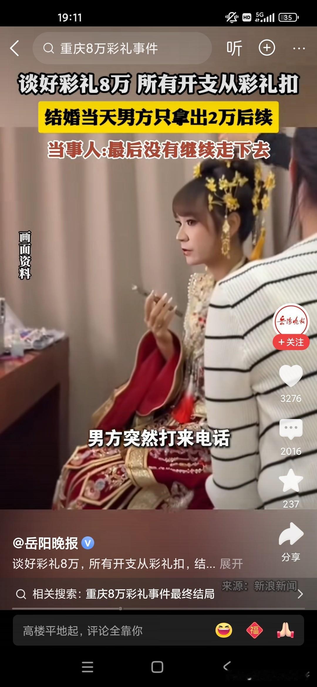 现在的二婚甚至三婚女子要求越来越高了,呃,也可能是因为头婚的时候,她们还不知道自己要什么,但是当二婚三婚的时候,她们已经恍然醒悟,所以说她们不仅追求有物质生活,还要追求有精神方面的富足,因此的话,很多男人没有结过婚的,可能会觉得女人要求怎么这么高,你不就是二婚吗?你还是三婚,在中国的传统社会都是不入流的,但是没有想到正是因为二婚三婚,她对婚姻看的非常透彻,她对于生活的理解更加深沉一些,所以说她才会那么挑剔,你看视频中的这个女子虽然是二婚,但是对于彩礼要求仍然是8万,这个男生耍心眼儿,说好的8万,最后改为2万,她就非常生气,她觉得男生不尊重他,男生的家人没有征求她的意见!就是希望在结婚当天的话给她难堪,逼她就范,但是没有想到她这么刚烈,最后坚决退婚。所以说我觉得大家最好在结婚之前的话就商量好,男生如果既然答应的话,那就要守信用,这样的话,这个老婆才会跟他好好过日子,要不然的话都是隐患!