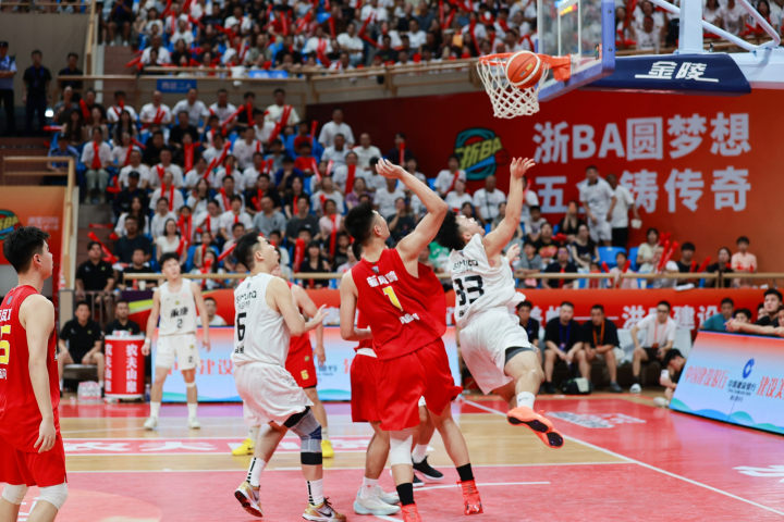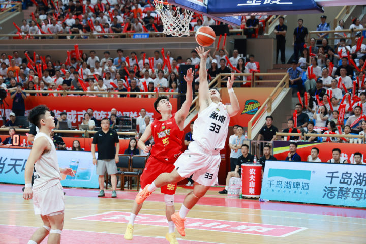 第四节,嘉兴队率先得分,永康队则通过积极的跑位,在篮下跑出空位接球轻松打进。
