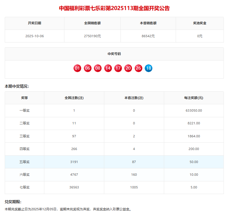 10月6日福彩中奖号码 七乐彩开出1注一等奖