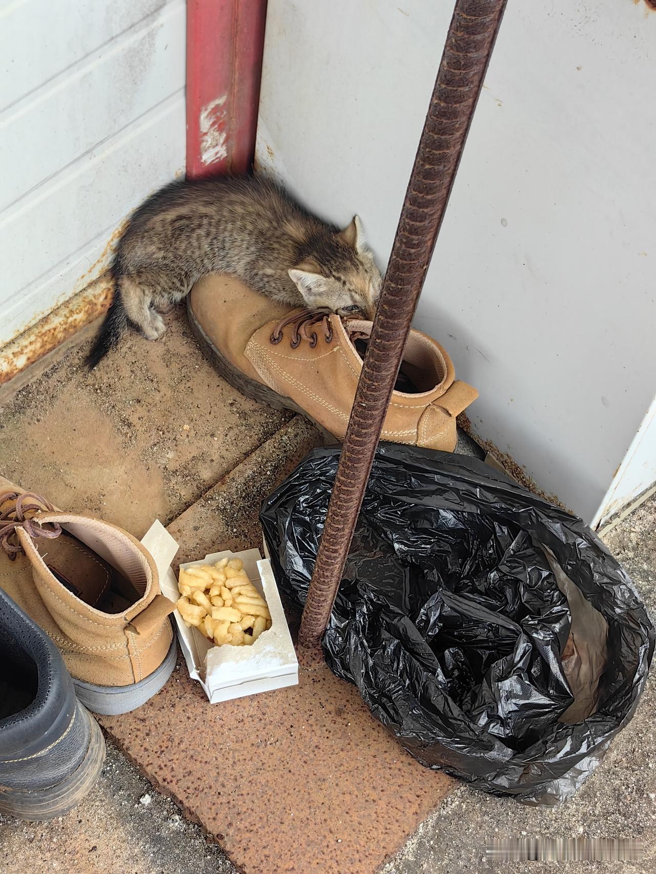 中秋节中午,我正准备上班。听见有猫叫,声音特别哑,一只小猫咪躲在鞋堆里,不仔细看