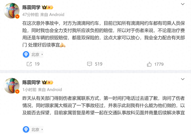 10月6日,针对3日发生的北京万寿路交通事故,知名车评人@陈震同学再次发声:昨天从有关部门得到伤者家属联系方式,第一时间打电话过去道了歉,询问了伤者情况,同时跟家属大概说了一下事故经过,并表示此刻我有什么能为他们做的,以及能否去探望,目前家属答复是希望一起在交通队事故科见面并商量后续解决事宜。