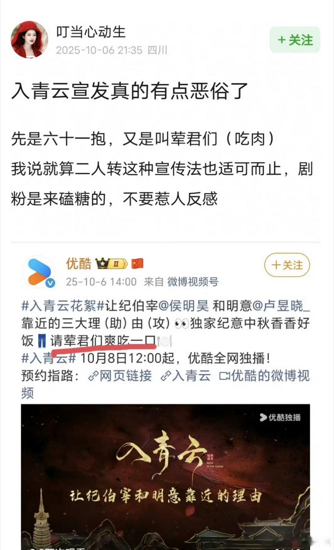 侯明昊、卢昱晓主演的入青云宣发被批恶俗[doge]