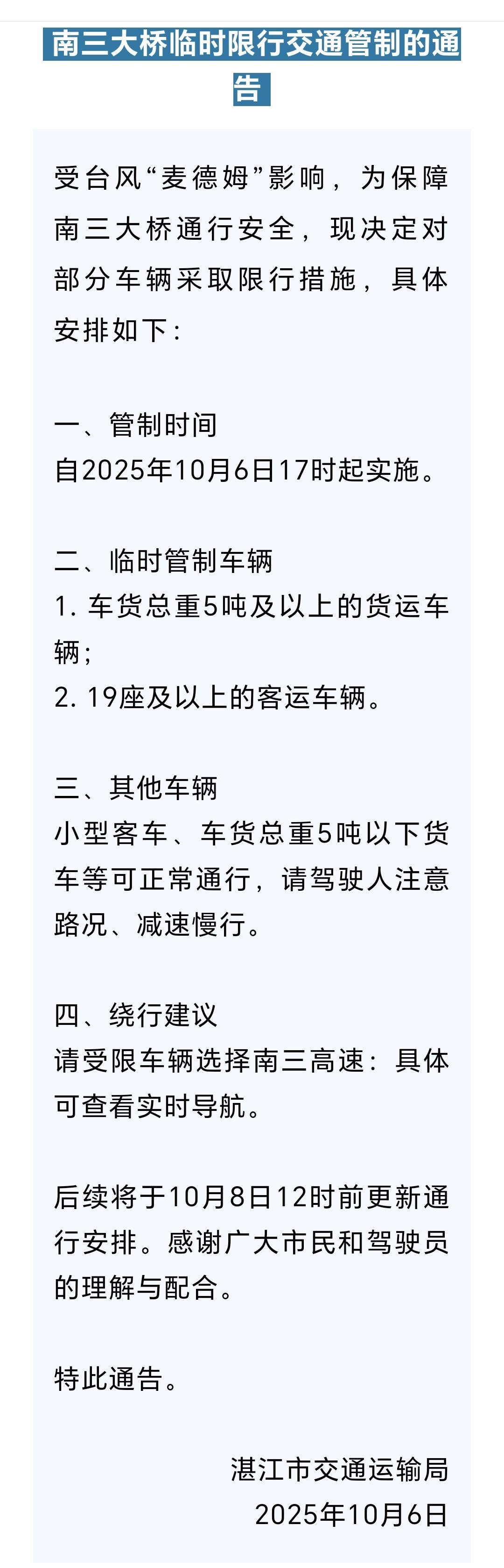 受强台风麦德姆的严重影响,为了保证通行安全,坡头区南三大桥自10月6日17时起实施临时限行交通管制。简单地说,就是电动车和普通私家车可以通行,大客车和大货车禁止通行。据了解,湛江环城高速鹭洲大桥正常通行。