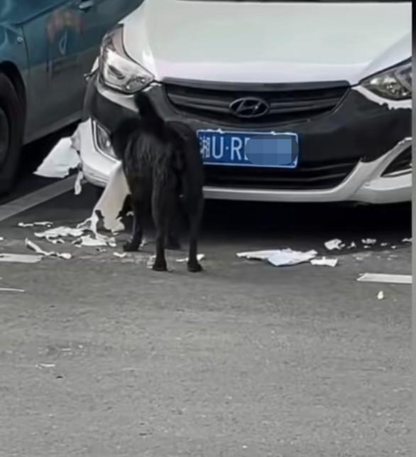 湖南一女子将自己的爱车停在小区楼下的店铺门口的停车位上,没想到却遭到一只黑狗的狂