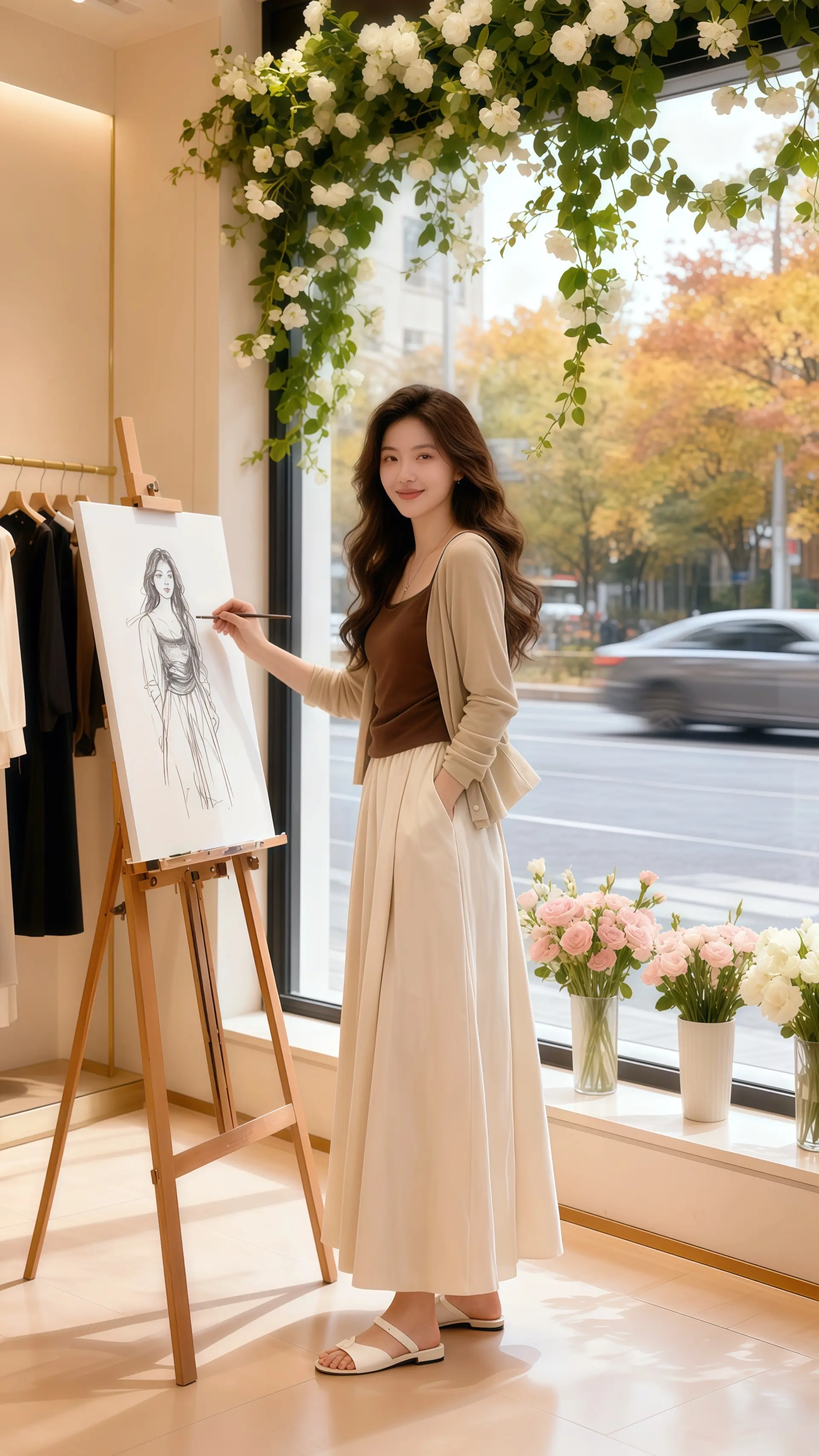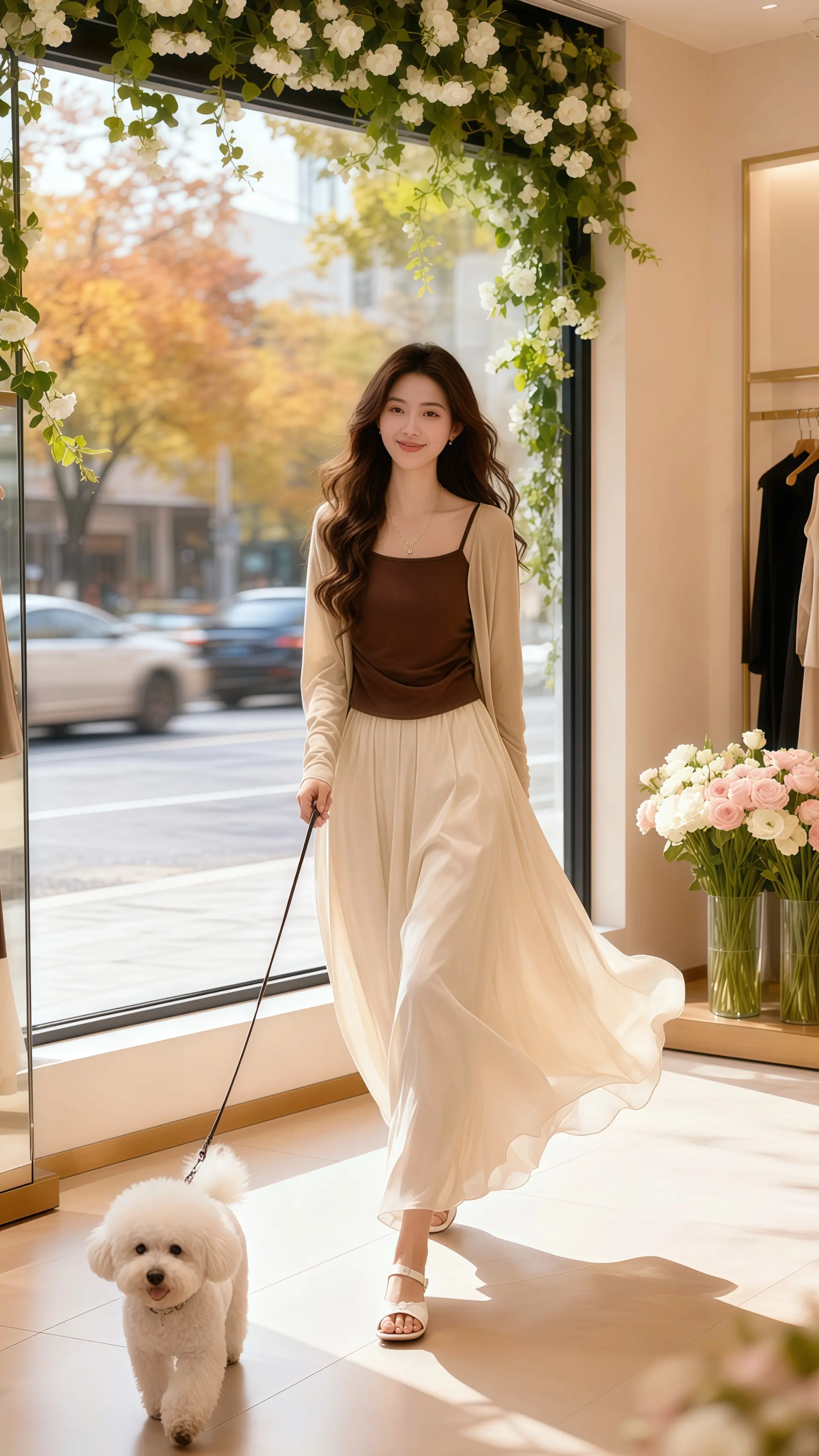 她穿着时尚休闲三件套,在轻奢女装店的落地窗前,与秋天撞了个满怀。米白色开衫慵懒地搭在肩头,浅灰色针织背心勾勒出柔和曲线,同色系休闲裙垂坠感十足,行走间满是随性惬意。窗外,金黄的秋叶在微风中摇曳,街道上的车流化作模糊光影,为这幅穿搭画卷添了几分诗意。她指尖轻拂过裙边,阳光透过缠绕着白花藤的落地窗,在她身上洒下斑驳光斑。这套三件套将舒适与时尚完美融合,无论是漫步秋日街头,还是在温馨小店休憩,都能尽显优雅气质。当开衫的温柔、背心的利落与长裙的浪漫相遇,便勾勒出独属于秋日的时尚风景线。