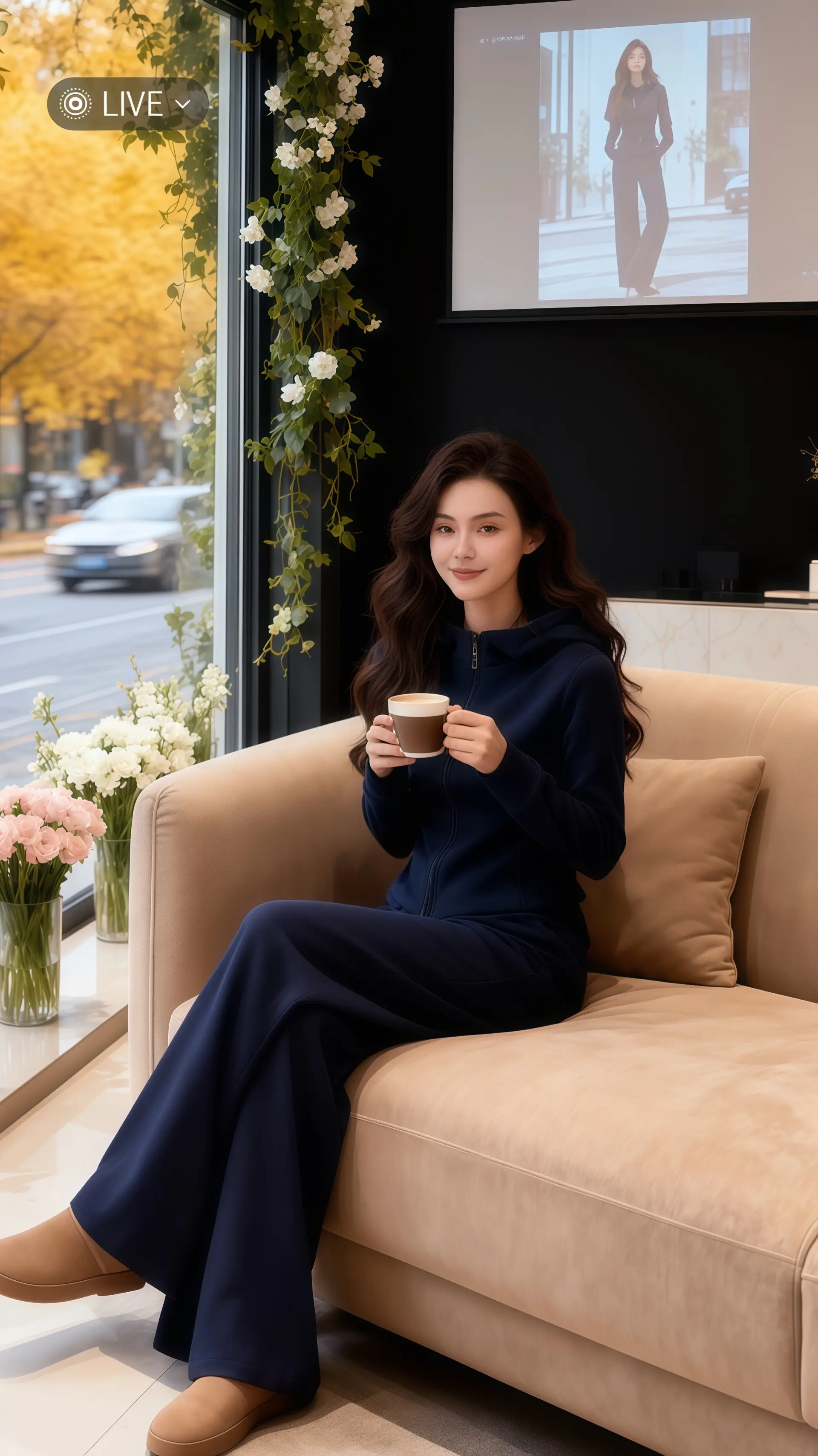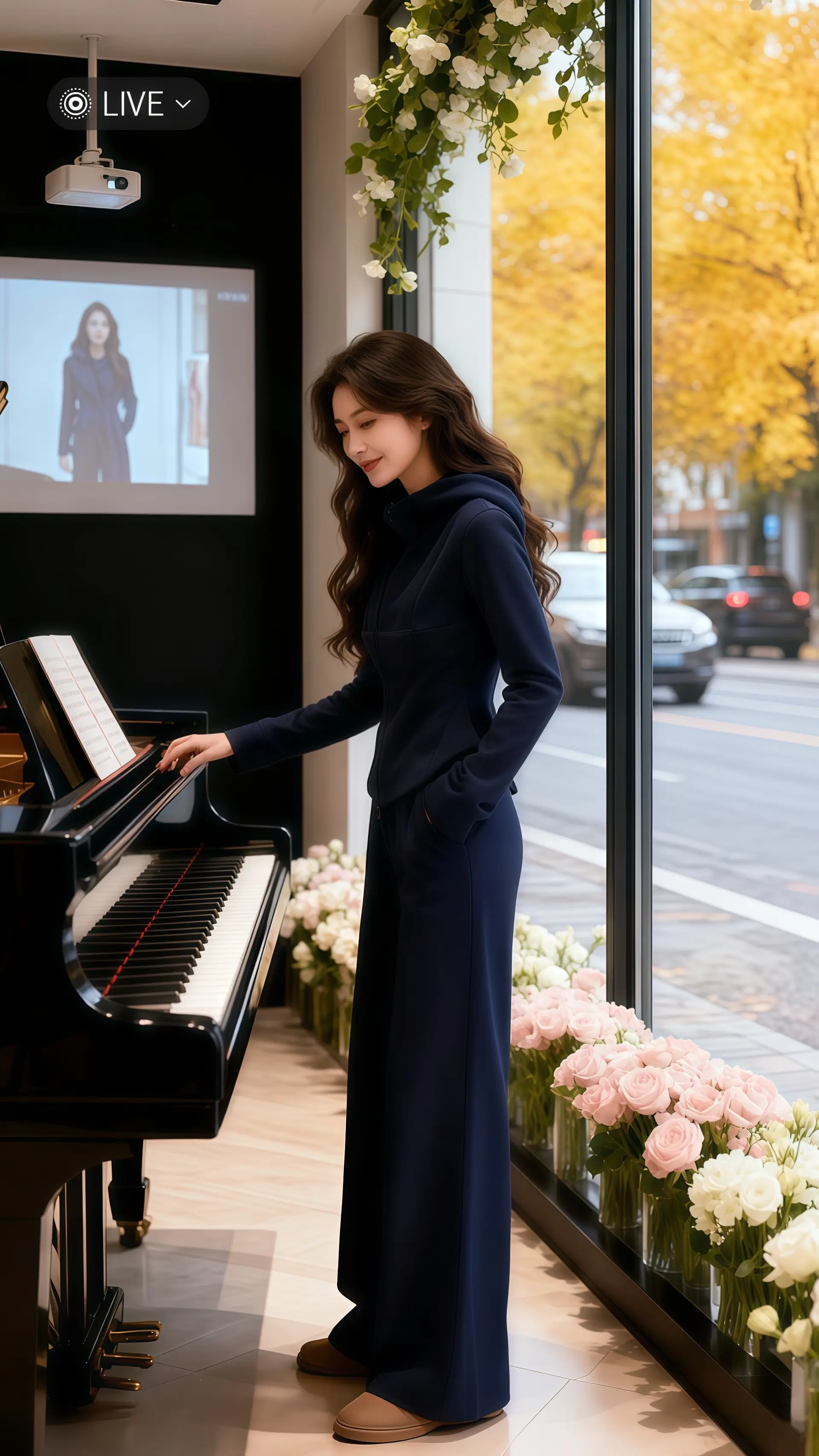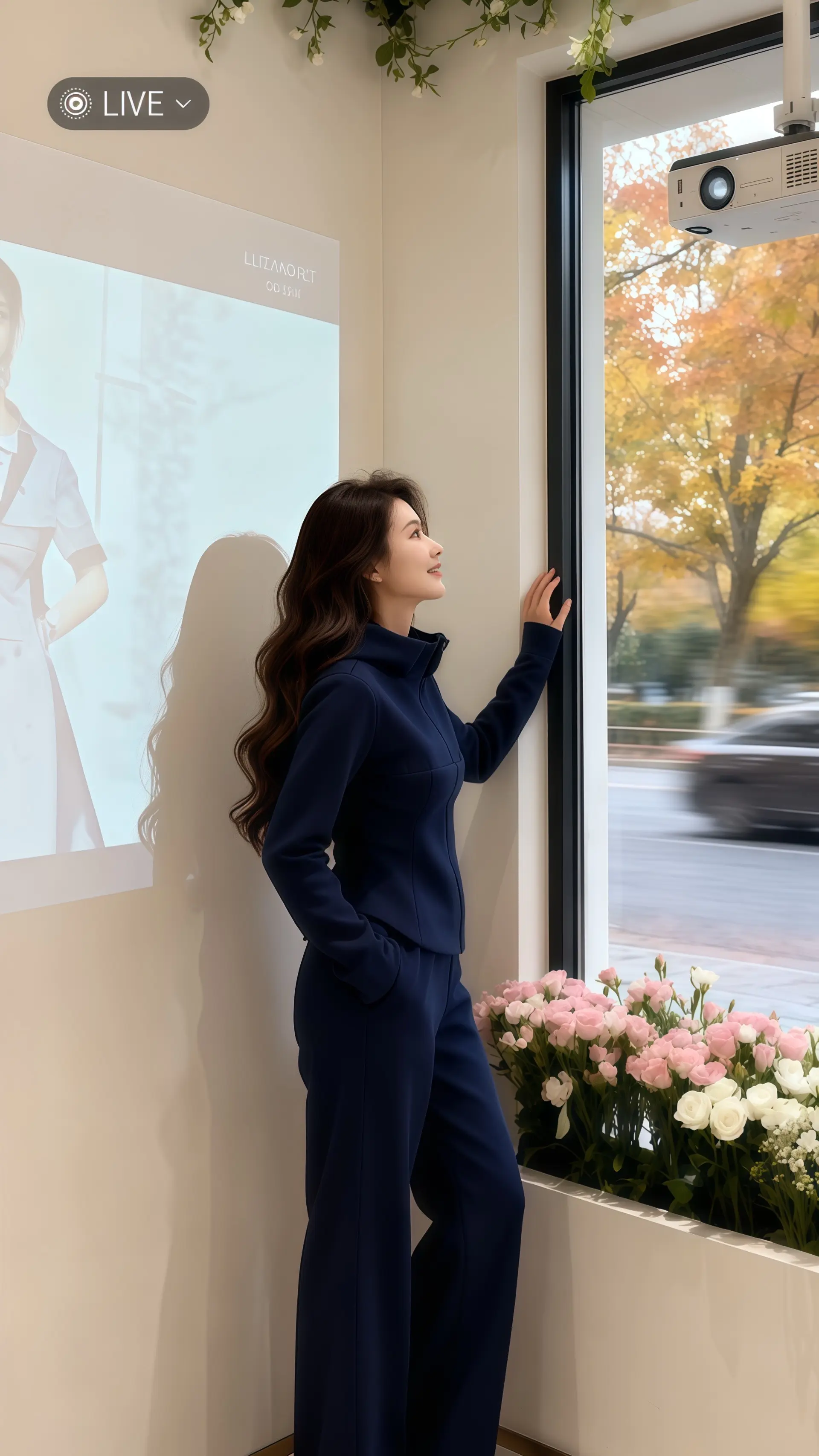 她身着深蓝色时尚连帽卫衣休闲阔腿裤两件套,在轻奢女装店的落地窗前,将秋日的氛围感拉满。波浪卷发衬着东方美人的温婉浅笑,侧身凝望投影仪中自己的身影,身后是浅粉白花与金黄秋景的虚实交织。这套穿搭把休闲与高级感揉得恰到好处,连帽设计添了几分随性,阔腿裤又藏着慵懒腔调,就像窗外秋日街道上的风,自在又有格调,穿上它,在轻奢店的转角,在秋景的晕染里,每一刻都是时尚画报的定格。