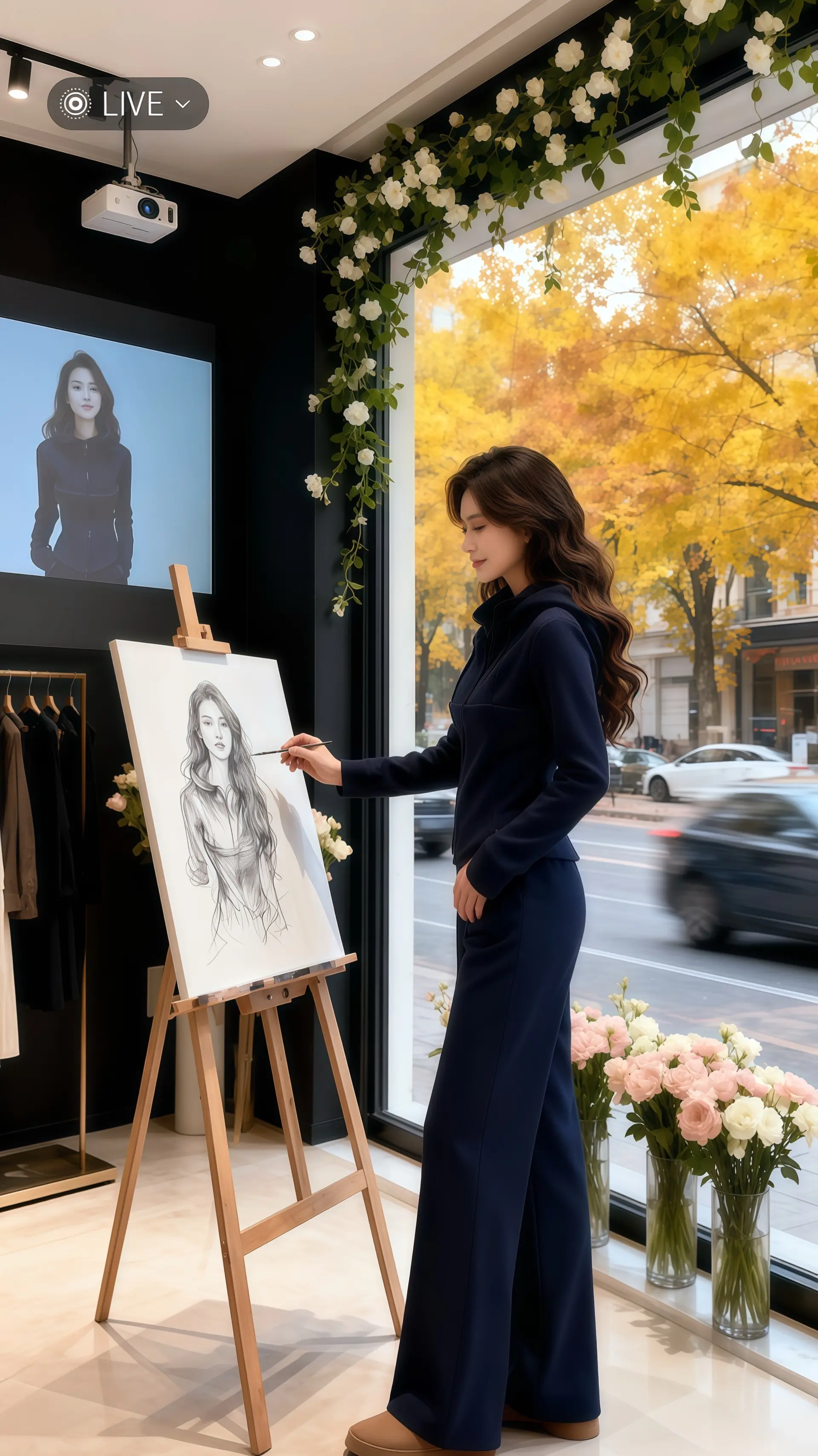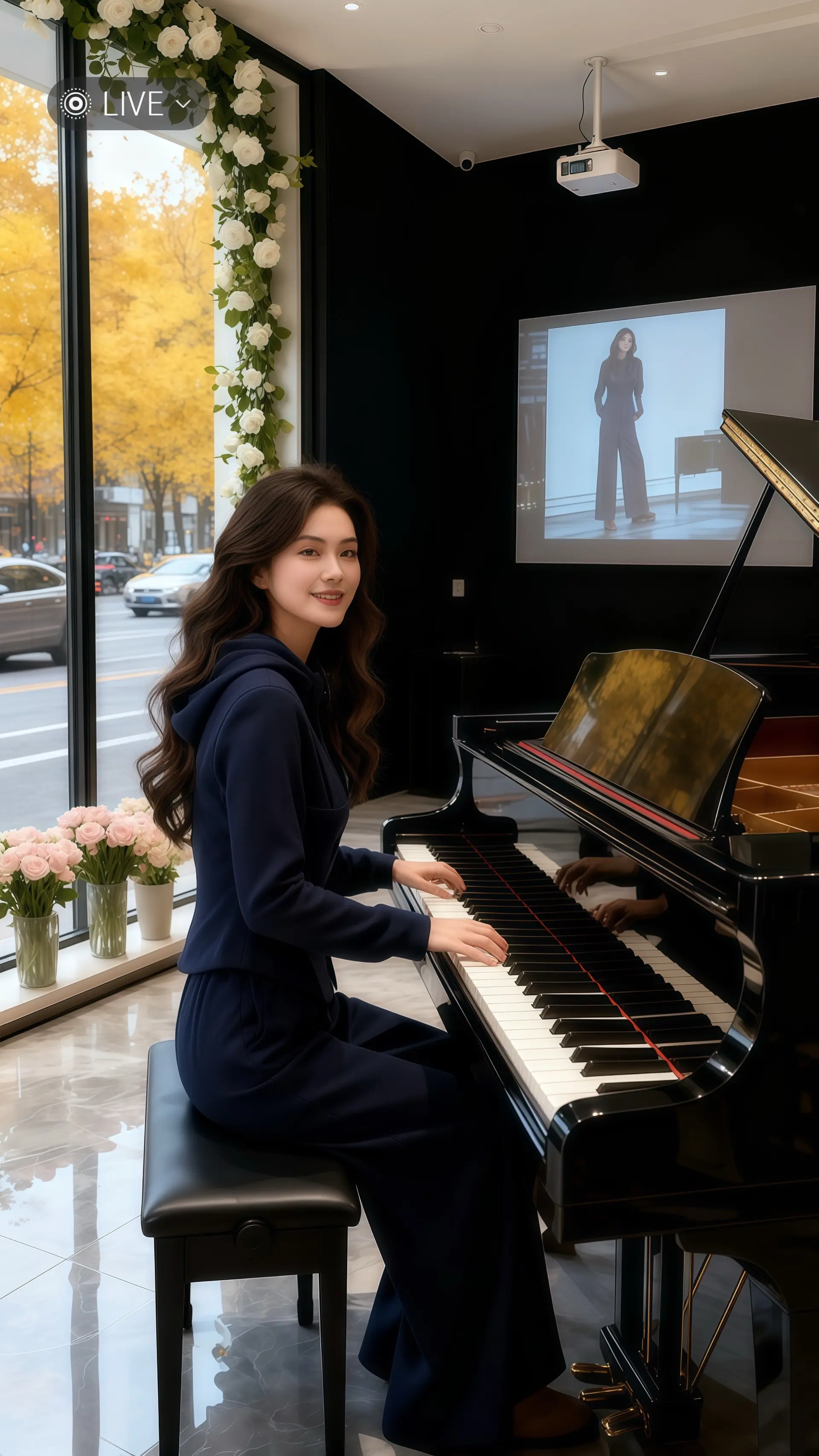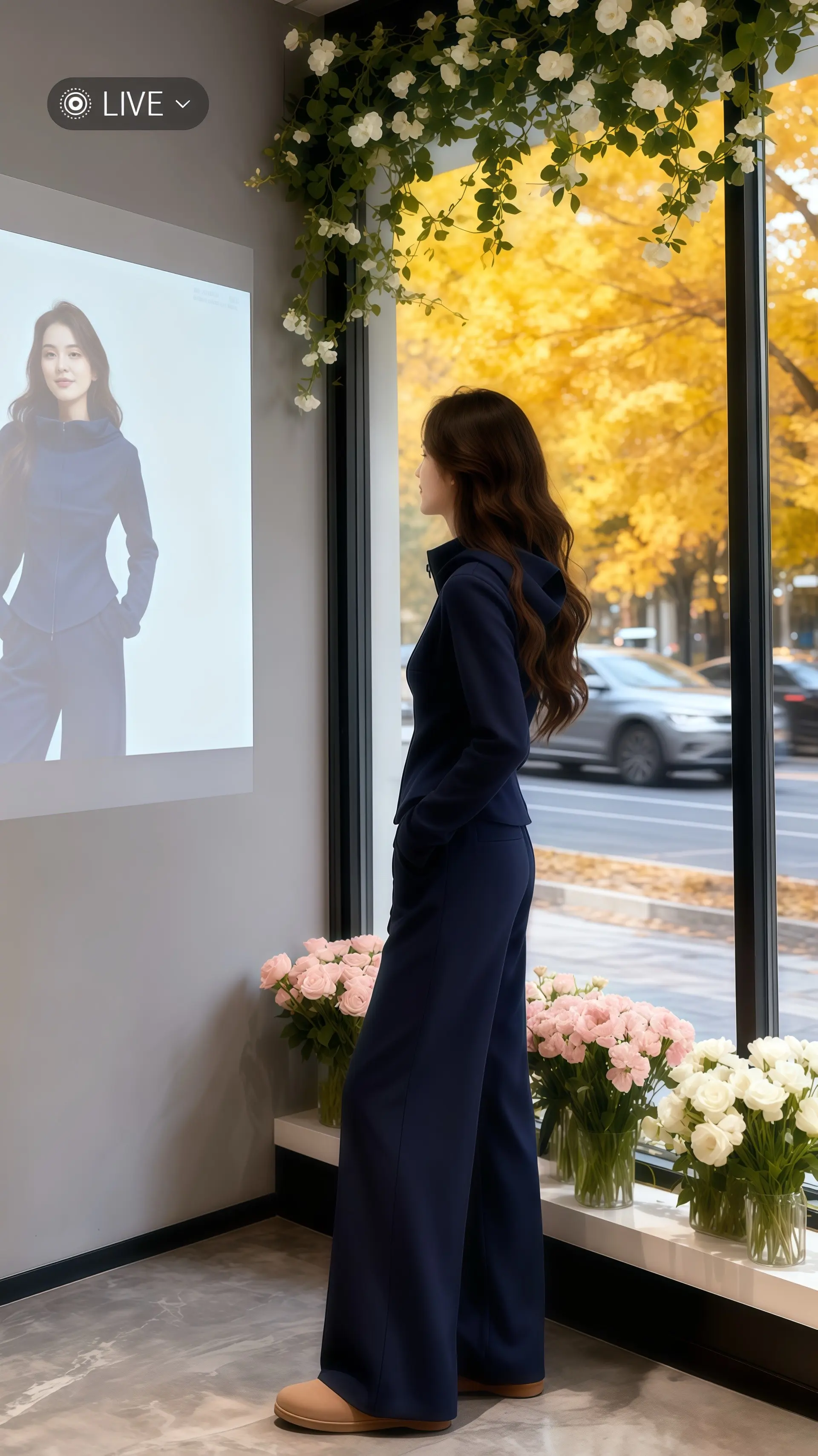 她身着深蓝色时尚连帽卫衣休闲阔腿裤两件套,在轻奢女装店的落地窗前自成风景。利落的剪裁勾勒出随性轮廓,连帽设计添了几分飒爽,阔腿裤的垂坠感让步履间尽是松弛腔调。窗外是金黄浸染的秋,街道上车影朦胧如电影帧。浅粉白花在窗边摇曳,绿藤绕着门框织就浪漫,投影仪将她的身影投在灰墙上,仿佛把时尚与秋意都揉进了这一方空间。她浅浅笑着,波浪长发拂过肩颈,这一身穿搭,既是都市女性的时髦宣言,也是秋日里关于松弛与高级的温柔叙事。