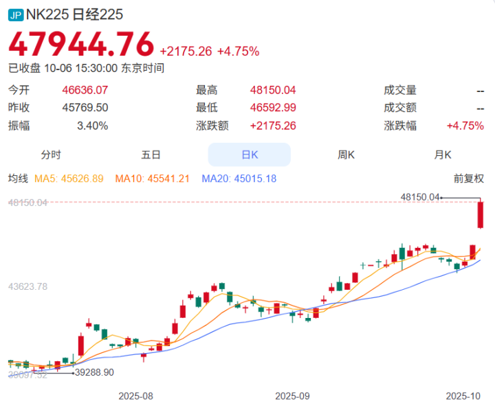 与黄金价格大涨类似,同样具备“避险属性”的日本资产在10月6日表现突出。其中,日经225指数暴涨超1800点,涨幅超过4%,再创历史新高。日元兑美元汇率则暴跌至150.435,创五个月最大单日跌幅。