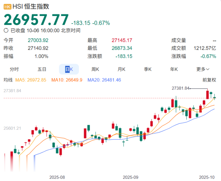 10月2日,港股迎来四季度首个交易日的强势开局。当日三大指数全线攀升,其中,恒生指数上涨1.61%,收报27187.12点,创近四年新高,成交额突破2224.68亿港元,凸显资金参与热情。不过到了10月6日,伴随着黄金价格和日本股市大幅上涨,港股市场出现一定的回落。