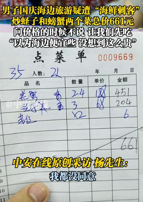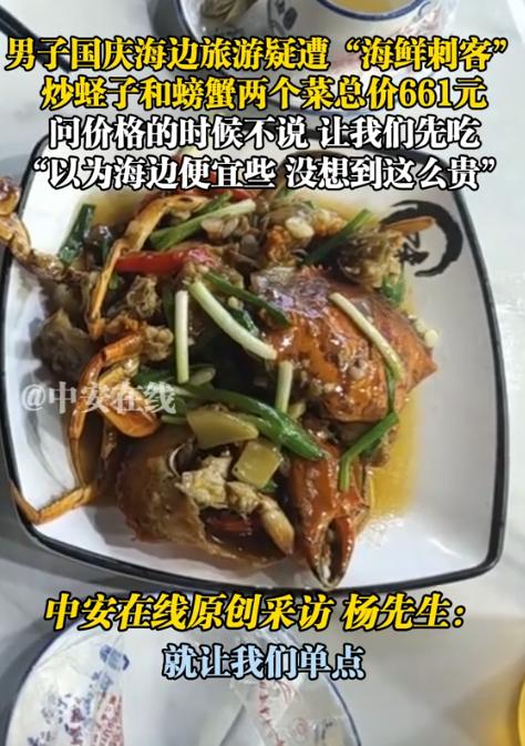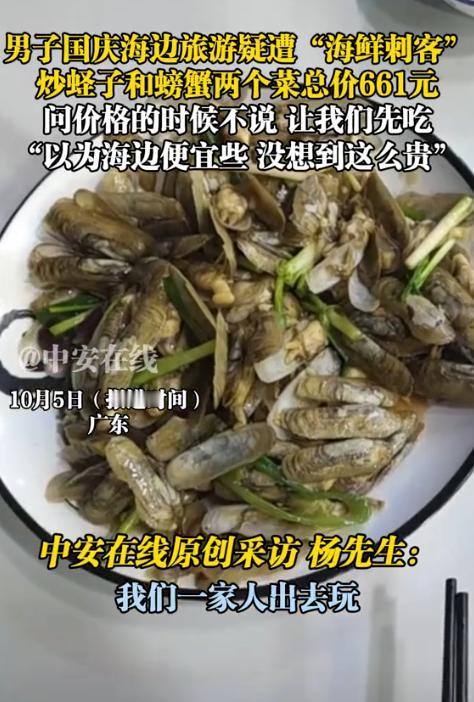 “一家店,凭一己之力砸了广东的招牌!”近日,男子国庆去广东海边旅游,点了一盘炒蛏子和2只螃蟹,竟被收661元!男子:“问价格的时候不说,让我们先吃,以为海边便宜些,没想到这么贵!”网友:太狠了,这种蛏子我们这边菜市场12块钱一斤! 杨先生(化名)一家开车到海边旅游,车刚停好,就沿着沙滩慢慢走。 整个人都放松了不少,比在城里舒服多了。 转眼到了下午,太阳不再那么晒,杨先生的肚子也开始叫。 看着沙滩边一排海鲜餐厅亮着“现捞现做”的灯牌,他琢磨着:“在海边吃海鲜应该又鲜又便宜,就这吧。” 他挑了一家看起来人挺多的店,门口一排玻璃缸,螃蟹、蛏子、皮皮虾都活蹦乱跳。 一个服务员赶紧迎上来:“老板几位?今天的膏蟹特别肥,刚上岸的。” 杨先生本想先看看手机上的团购,想着能省点是点。 可刚打开,服务员摆手:“团购昨天就结束了,现在只能单点。” 杨先生以前在别的景区也遇到过这种情况,怕被宰。 杨先生赶紧问:“那蛏子多少钱一斤?螃蟹呢?” 服务员没正面回答,反而拿起网兜就往缸里捞:“您放心,我们家明码标价,肯定不会坑人。您看这蛏子,多新鲜,刚下的船。螃蟹是要膏蟹还是肉蟹?膏蟹现在正肥,掰开全是黄。” 杨先生听着有点不踏实,又问了一遍:“你先把单价说清楚,我好算个大概。” 服务员笑嘻嘻地说:“您先选,我给您称出来再算,价格肯定比城里实惠。海边都是老客人,不会骗您。” 杨先生心里还是有点犹豫,可家人已经等得不耐烦了:“都来了,就吃吧,海边哪能贵到哪去?” 他想了想,觉得自己也太多心了。 以前去青岛、厦门吃海鲜,人均一两百就能吃得不错。 于是点了点头,让服务员捞了几斤蛏子,又选了两只膏蟹,叮嘱一句:“少放辣。” 坐下后,杨先生擦了擦手,心想:“算了,出来玩,别太计较,吃顿开心的就行。” 等菜上桌,蛏子确实鲜,蟹也肥,味道倒没问题。 可吃完一结账,账单一出来,杨先生愣了,螃蟹2.4斤,按188元一斤算,要451元。 蛏子3斤,68元一斤204元,再加上两个人的茶位费6块,总共661元。 “俩菜六百多?!” 杨先生当场傻眼。 他明明提前问过价格,店家却避而不谈,现在才告诉他数,这让他越想越不对劲。 回到酒店后,他越琢磨越气,把这事发到了网上。 一时间,引来了不少网友的共鸣。 有人说:“太黑了,我们那蛏子才十几块钱一斤!” 还有人贴出青岛、厦门的价目表,说节假日再涨价,也不至于这么离谱。 更有人晒出自己的遭遇:“我在那家店吃三个菜一千多”“团购说用不了,结果被宰惨了。” 面对质疑,店家也不认账。 老板说自己“早就报过价”,还强调给杨先生打了折:“膏蟹标价288一斤,给他按188算,根本没赚多少。” 老板甚至放话说要调监控作证,还抱怨杨先生不该发网上,“这种曝光属于违法投诉”。 可网友不信,很多人质疑那3斤蛏子是不是连水带壳称的,“秤都不知道准不准”。 不少老吃客也出来支招:在海边吃海鲜,最好点菜前看清楚价目表,让店家当面称重、沥干水,不要让他们拿厚塑料袋装水称。 称完立刻确认总价,再决定吃不吃,能少掉很多坑。 如今,这661元的账单杨先生还没得到店家的合理解释。 原本计划的轻松假期,被这顿饭搅得心情全无。 对此你怎么看? 信源:中安在线