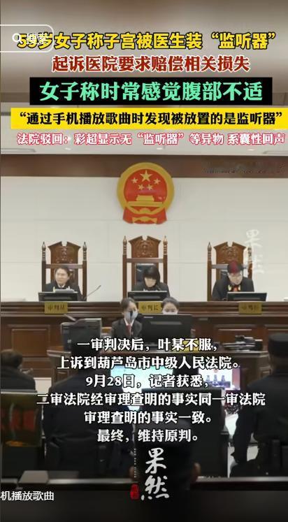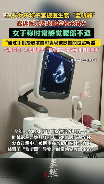 辽宁一59岁女子去医院取避孕环,几年后,她用手机播放歌曲时,发现医生悄悄在她子宫里安了监听器,导致她肚子很难受,女子一气之下,把医院告上法庭... 据齐鲁晚报9月29日消息,有一女子竟将一份再平常不过的“囊性回声”超声报告,看作是医生给她安装监听器的证据,直接将这件事情告上了法庭。 起因是在2016年的时候,孙某(化名)在所居住于的县医院里面照做了一个避孕环取出手术,本是个简单的小手术,可从那以后,她就常觉得肚子隐隐作痛。 疼痛没完没了,让她越来越紧张,怀疑是不是手术出了问题。多年后,有一次她用手机放音乐时,腹痛突然加重,一个念头闪过脑海,是不是身体里有东西? 孙某越想越害怕,而且根据日常的疼痛感,在她心里面认定了是医生给她安装了一个“监听器”。 然而就在前一段时间她实在是放心不下,就去了另一家医院进行检查,谁知这里的检查结果上面显示并没有什么所谓的“监听器”,而是有囊性回声且伴随着少量积液。 面对这样的结果,医生立马与孙某解释说,这这种情况很常见不用太在意,不料孙某还是觉得就是放了“监听器”所以才会有这样的情况,直接就给医院告上了法庭。 法院接到案件之后,为了能够找出有利的证据,专门请来了医学专家出具鉴定,专家明确指出,“囊性回声”只是说明体内有液体,与金属或电子设备毫无关系。 法院觉孙某提供的检查报告并不能当成直接的证据,所以一审直接驳回了她的请求。面对这样的判决孙某心里面很是不服气,直接就提起了二次诉讼。 法院觉得没有在提供新的证据,就维持了一审原判,最终,这场官司以孙某的全面败诉告终,也提醒公众,维权必须建立在科学和理性的基础上。 这件事情被网友们看到了之后,成了新的笑料,不少网友调侃:“难道医生有收取细胞分裂声音的癖好,在子宫里面安装一个监听器”。 但当我们冷静下来思考的时候,讨论事情背后的问题,如果维权只靠主观臆想,不仅浪费司法资源,也容易伤害无辜,法律是要求讲证据的。 那么,通过这件事情告诉我们,社会除了用法律划清界限,也要学会用理解去接住那些走偏的人,理性和温度并不冲突。 对此,你还有什么想说的吗?