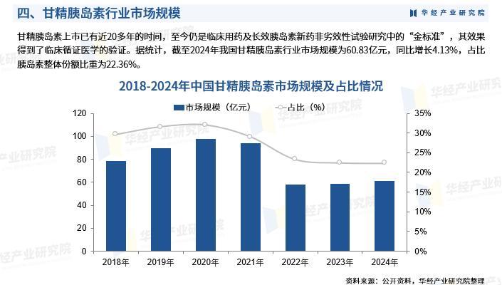 甘精胰岛素上市已有近20多年的时间,至今仍是临床用药及长效胰岛素新药非劣效性试验研究中的“金标准”,其效果得到了临床循证医学的验证。据统计,截至2024年我国甘精胰岛素行业市场规模为60.83亿元,同比增长4.13%,占比胰岛素整体份额比重为22.36%。