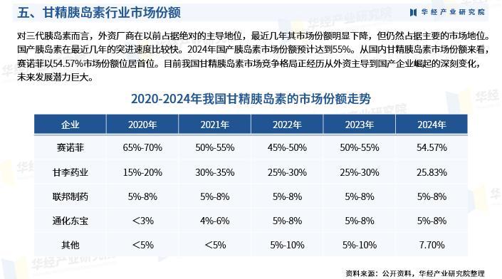 对三代胰岛素而言,外资厂商在以前占据绝对的主导地位,最近几年其市场份额明显下降,但仍然占据主要的市场地位。国产胰岛素在最近几年的突进速度比较快。2024年国产胰岛素市场份额预计达到55%。从国内甘精胰岛素市场份额来看,赛诺菲以54.57%市场份额位居首位。目前我国甘精胰岛素市场竞争格局正经历从外资主导到国产企业崛起的深刻变化,未来发展潜力巨大。