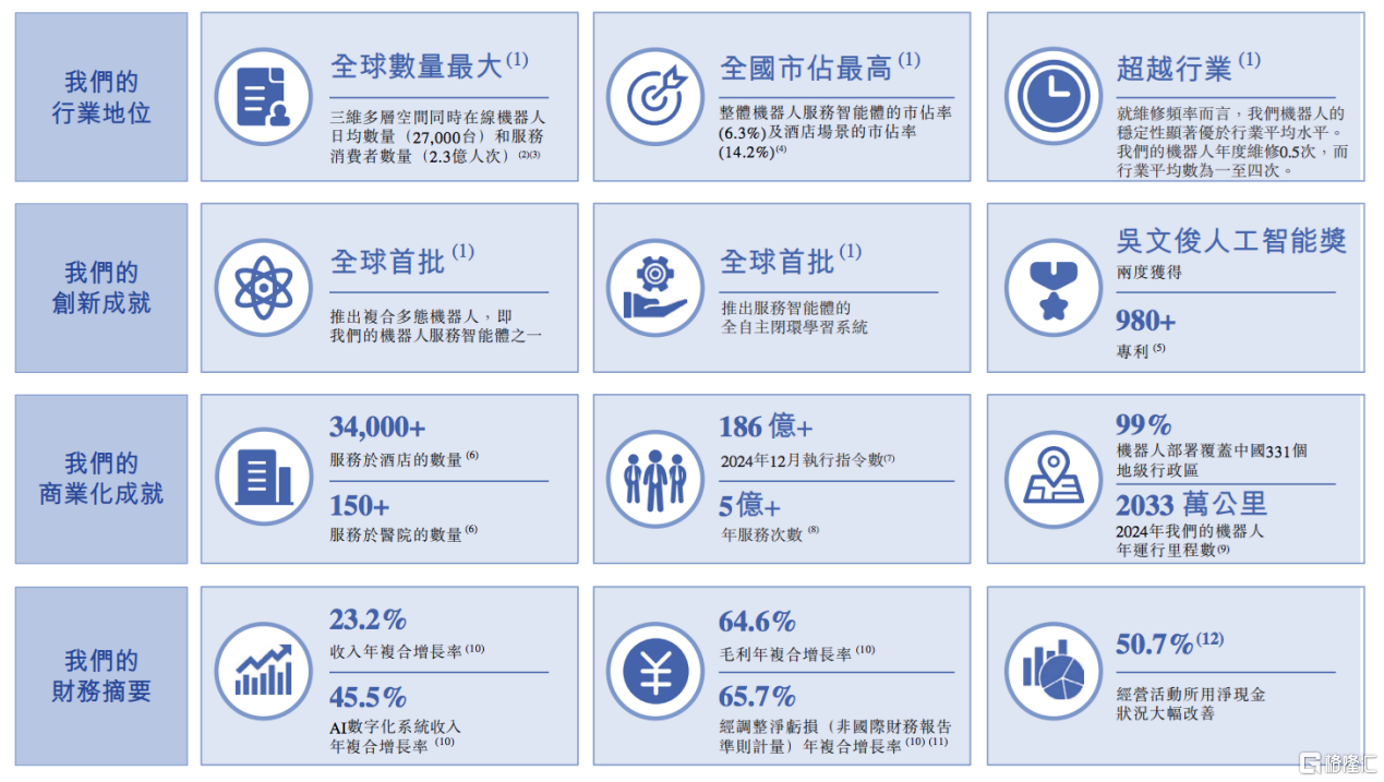 从行业排名来看,2024年,云迹科技在中国机器人服务智能体市场地位领先:以收入计,其在中国的市场份额达6.3%,位居行业首位;在酒店细分场景中优势更为突出,市场份额高达13.9%,持续领跑行业。值得注意的是,该赛道市场份额正向龙头企业进一步集中,第二至第五名企业的市占率合计仅为13.5%,尚未达到云迹科技一家的水平,凸显其难以撼动的龙头地位。