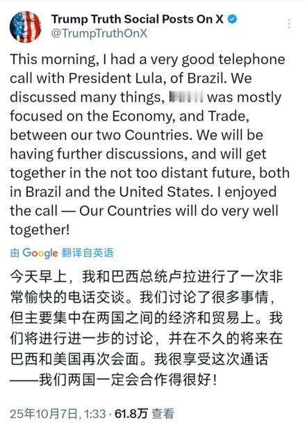 美国总统特朗普与巴西总统卢拉通完电话后,特朗普今天(北京时间10月7日)发文写道:“今天早上,我和巴西总统卢拉进行了一次非常愉快的电话交谈。我们讨论了很多事情,但主要集中在两国之间的经济和贸易上。我们将进行进一步的讨论,并在不久的将来在巴西和美国再次会面。我很享受这次通话我们两国一定会合作得很好!” 就在三个月前的7月,双方还因关税问题剑拔弩张——特朗普威胁对巴西产品加征50%关税,巴西外交部直接退回措辞冒犯的信函,卢拉更是公开怒斥“我们不需要一个皇帝”。 而双方愿意坐下来谈,核心驱动力还是经济利益的互补性。巴西作为全球农业大国,是美国农产品出口的重要市场,而美国则是巴西亟需的投资和技术来源国。 尽管特朗普曾宣称美巴贸易“不公平”,但巴西财政部的数据摆得很清楚:过去15年美国对巴西贸易顺差超过4000亿美元,美国企业在巴西的农产品加工、能源开发等领域赚得盆满钵满。 尤其是在新能源领域,巴西米纳斯吉拉斯州的锂矿资源成为双方合作的焦点,特斯拉早在2023年就计划收购当地的西格马锂业,目标年产76.6万吨锂,这对美国新能源产业链的原材料保障至关重要。 卢拉政府虽然在外交上强硬,但也明白美国市场和投资对巴西经济的重要性,所以在7月关税争端爆发后,一边成立专门工作组应对,一边悄悄扩大对美大豆进口,这种务实态度为此次通话埋下了伏笔。 不过“愉快交谈”掩盖不了双方根深蒂固的矛盾。最直接的就是贸易逆差的统计分歧,特朗普始终认为美国“吃亏”,但巴西副总统阿尔克明一针见血地指出,提高关税不仅不公平,还会推高美国自身供应链成本。 美国咖啡协会的数据显示,美国市场50%以上的橙汁和三分之一的咖啡来自巴西,一旦加征关税,美国超市货架上的果汁价格可能上涨30%,这会直接冲击美国消费者和相关行业的就业。 更敏感的是司法主权问题,特朗普在7月的信函中居然要求卢拉停止对前总统博索纳罗的司法调查,称其遭遇“政治迫害”,这种干涉他国内政的做法让卢拉极为愤怒,公开强调“巴西的司法程序不容任何外来威胁”。 此次通话虽然没提这件事,但这个心结显然还在,这也是双方未来合作必须跨越的障碍。 地缘政治因素更让这场合作充满变数。卢拉作为左翼领导人,一直致力于推动金砖国家合作和南美一体化,这与特朗普的“美洲经济繁荣伙伴关系”计划存在天然竞争。 特朗普此前威胁对与金砖国家保持一致的国家加征关税,卢拉当即回怼这种做法“错误且不负责任”。 双方在气候变化议题上分歧更大,卢拉积极推动巴黎协定,而特朗普政府的能源政策更倾向于传统化石燃料,这在巴西近海油田开发、亚马逊雨林保护等问题上可能产生新的摩擦。 不过精明的政治家都懂得“求同存异”,此次通话聚焦经贸而非争议议题,正是这种务实策略的体现。 美国希望通过合作拉拢巴西,减少中国在南美地区的影响力——中国是巴西最大的贸易伙伴,双方在基础设施和能源领域合作密切;而卢拉则想借助美国的投资推动巴西工业化,同时在多边舞台上保持独立性,这种微妙的平衡将贯穿未来的合作进程。 特朗普提到的“不久后再次会面”,大概率会围绕双边贸易协定展开谈判。美国可能会要求巴西降低农产品关税,扩大对美牛肉、玉米的进口;而卢拉则会争取美国取消对巴西钢铁、铝制品的惩罚性关税,同时推动美国企业加大对巴西基础设施的投资。 不过谈判过程肯定不会一帆风顺,巴西农业部长法瓦罗已经放话,若美方施压就开拓中东、南亚等替代市场,这种“两手准备”的策略让巴西在谈判中多了几分底气。 值得注意的是,双方在锂矿合作上可能率先取得突破,美国新能源产业对锂资源的迫切需求,与巴西希望发展高附加值产业链的诉求不谋而合,特斯拉的锂矿收购计划或许会成为合作的样板项目。 说到底,美巴关系就像一盘复杂的棋局,特朗普和卢拉的通话只是其中一步。表面上的“愉快合作”背后,是两国在利益分配、主权尊严、地缘战略等层面的持续博弈。 短期内,经济互补性会推动双方在农产品、能源等领域达成一些合作成果,但长期来看,政治理念的差异和地缘利益的冲突很难完全调和。特朗普想要用“美国优先”的逻辑主导合作,卢拉则要维护巴西作为发展中大国的自主地位,这种张力会让未来的美巴关系充满不确定性。 但可以肯定的是,只要能实现各自的利益诉求,哪怕三个月前还在互相指责,两国领导人也能坐下来进行“非常愉快的交谈”,这就是国际政治的现实逻辑。