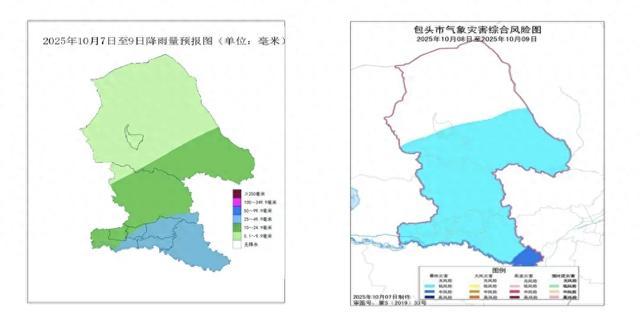 受降雨影响,10月8日至9日市区、土右旗城市内涝风险高,市区、土右旗、固阳县农田渍涝风险高,市区、土右旗、石拐区、固阳县山洪、中小河流洪水和地质灾害风险较高。