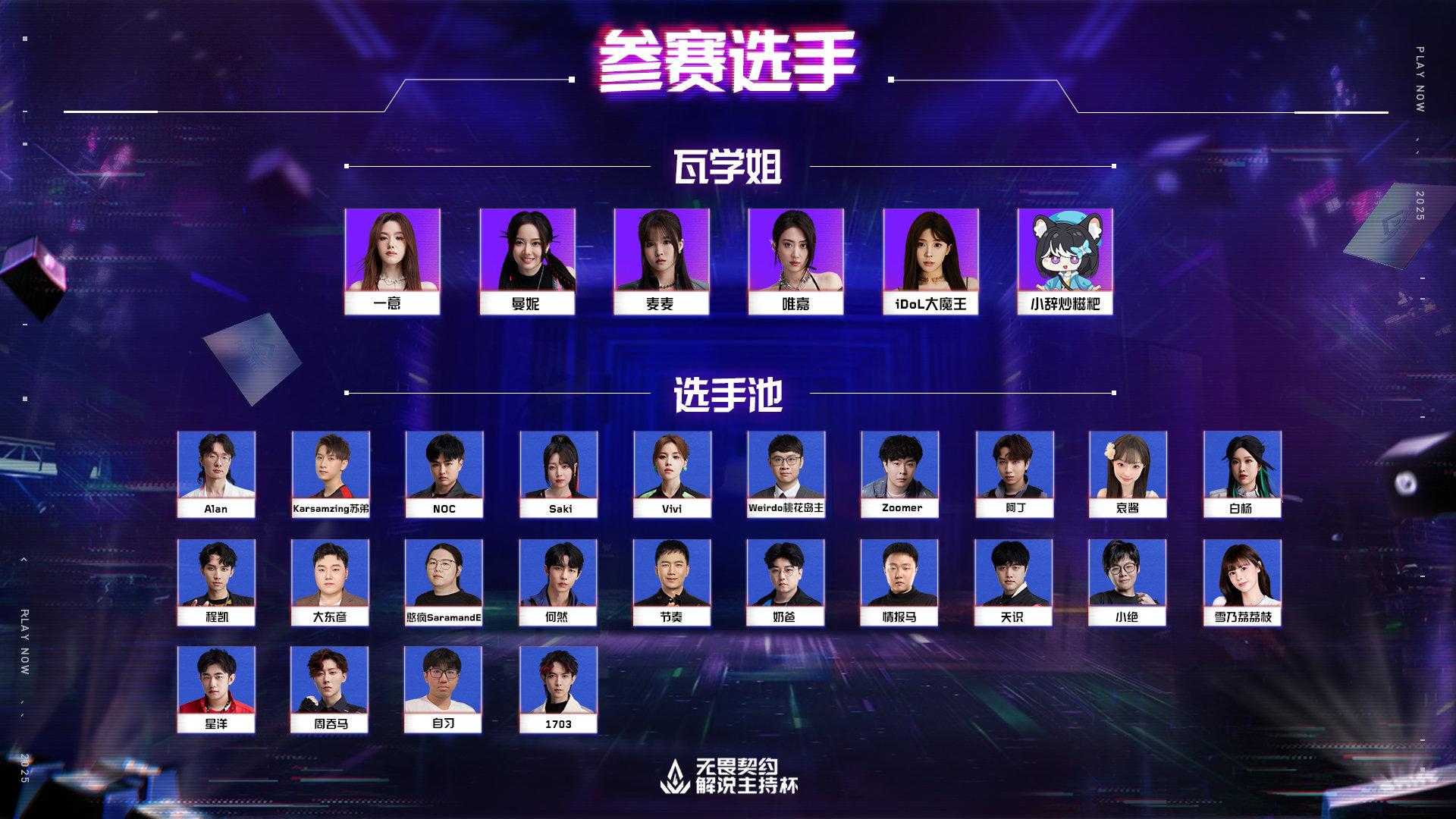 本次无畏契约解说主持杯将由17位官方解说主持和13位知名主播嘉宾共同参与,30位选手将分为6队。赛事主办方将指定6位“瓦学姐”为队长,“瓦学姐”们会先自行邀请一位“瓦学弟”进行组队匹配,随后“瓦学姐”将在选人大会从剩余人选池中选择队员,构成最终阵容。所有选手将由主办方根据段位、实力等综合因素分级进入人选池,每队可选择1名S级,1名A级,1名B级。