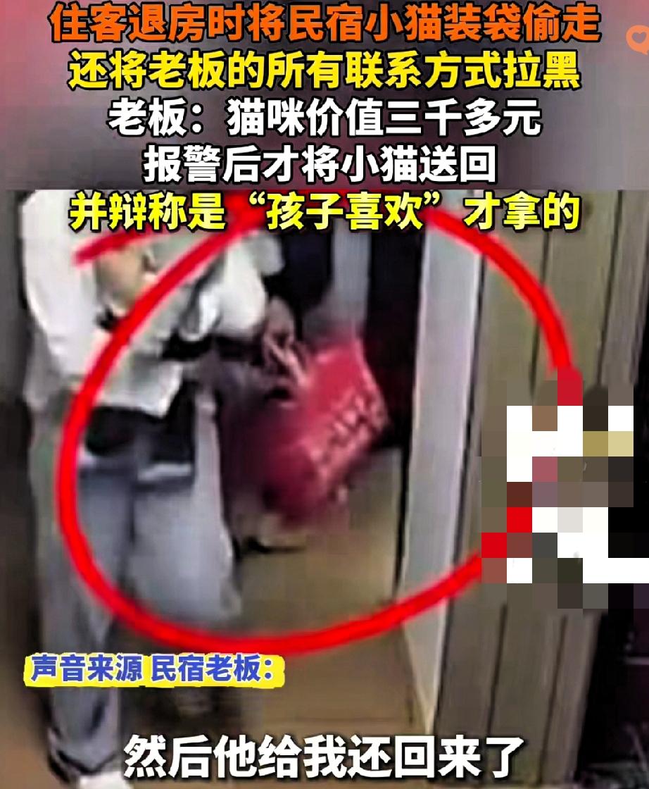 民宿老板盯着监控画面,手都凉透了! 住了两天的客人,退房前居然把店里的猫往帆布袋里塞,拉拉链的时候,他家孩子就站在旁边眼睁睁看着! 发现猫丢了联系对方,直接被拉黑,直到报了警才肯送回来,还理直气壮说“孩子喜欢”,甚至要求去高速路口接猫——这哪是孩子喜欢,分明是大人没底线,拿孩子当遮羞布! 3500块的猫早就够刑事标准了,别拿“孩子小不懂事”当借口,大人心里门儿清这是偷。 你当着孩子的面做这种事,不是爱他,是把“想要就能抢”的坏根种进他心里,这才是真的害他一辈子。 你们遇没遇过拿“孩子喜欢”当幌子的离谱事? 这种打着爱的名义教孩子突破底线的操作,你觉得能算合格的家长吗?评论区聊聊~