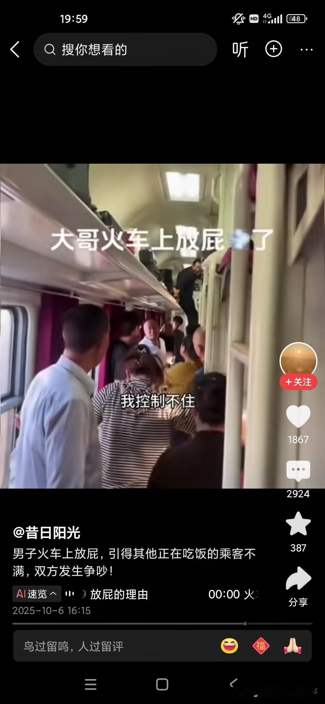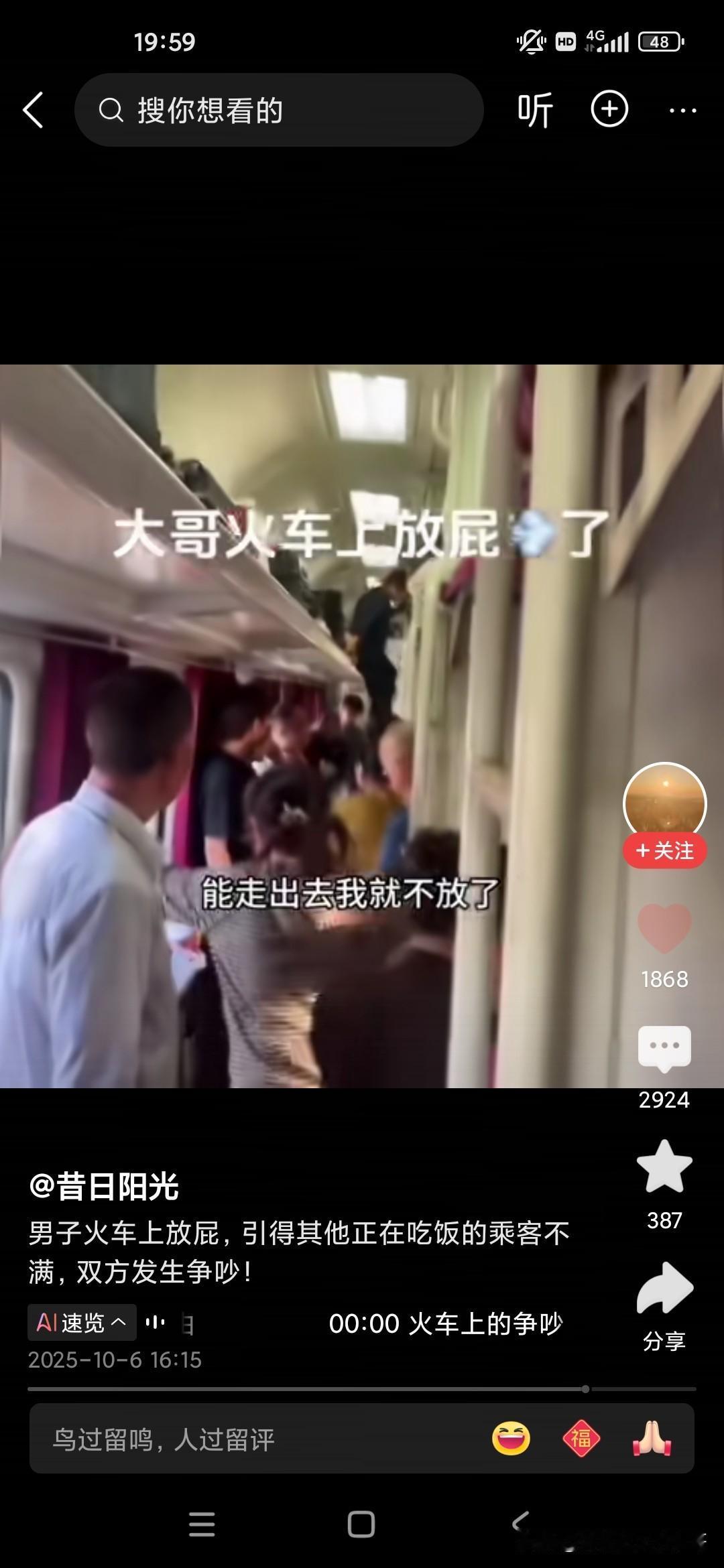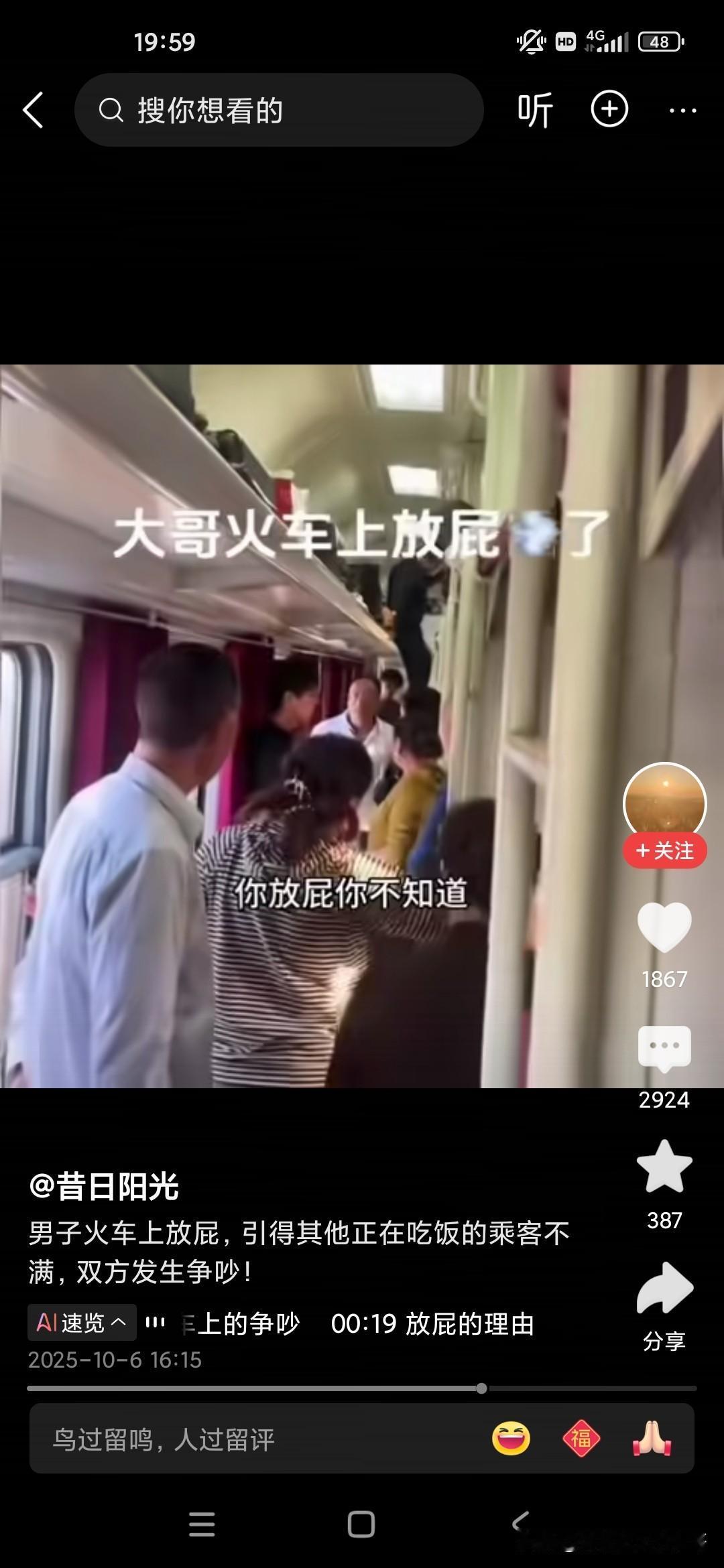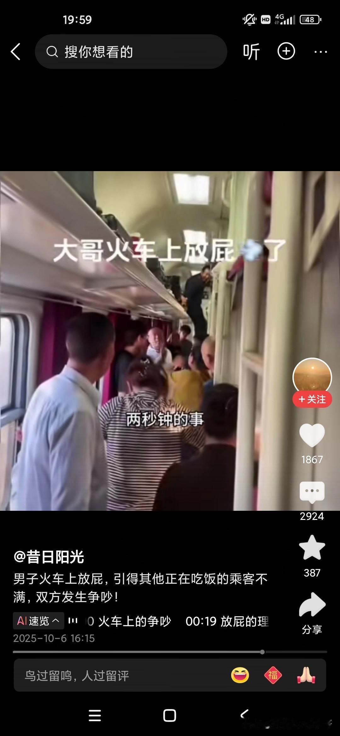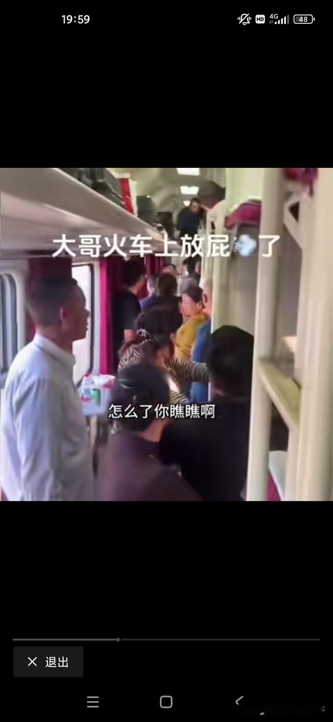 一位男子在卧铺车厢不小心放了一个响屁,结果很不是时候,很多人还在吃饭,尤其是吃的津津有味的时候,突然听到一声臭屁,而且还是很响亮的那一种,这个男子也是真的不是时候,而且还专门找这种不是时候的时候放屁,虽然说管天管地管不住别人拉屎放屁,但是有时候也不能没有眼色,否则小事也会变成大事,甚至会引起血案来,要不是警察及时赶到,估计要引起极大的动乱了!这也给所有人提了个醒,你可以默默放屁,但是不要明目张胆地故意放屁!